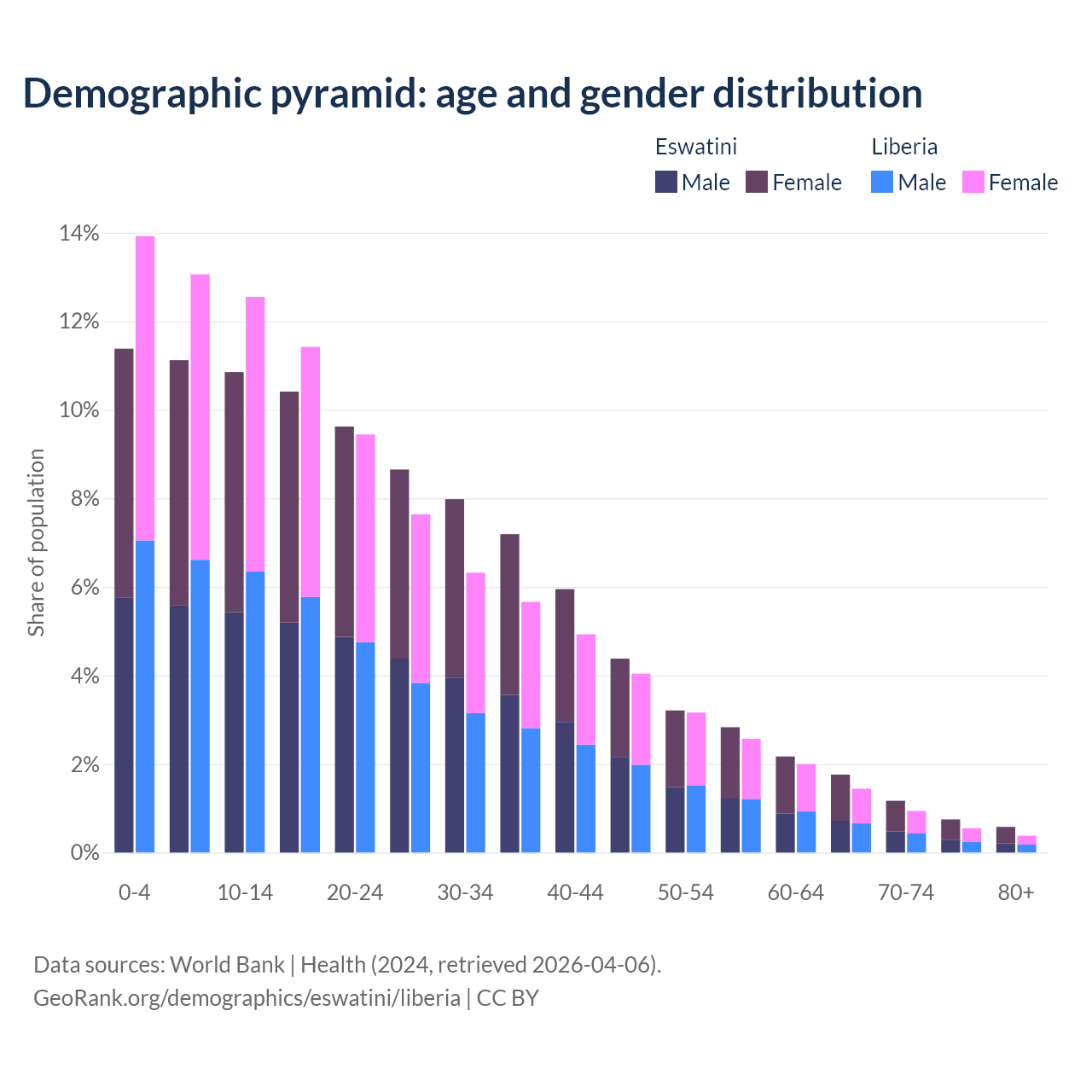 - The share of young demographic (0-15 years old) in Eswatini is 33.4% vs 39.5% in Liberia.