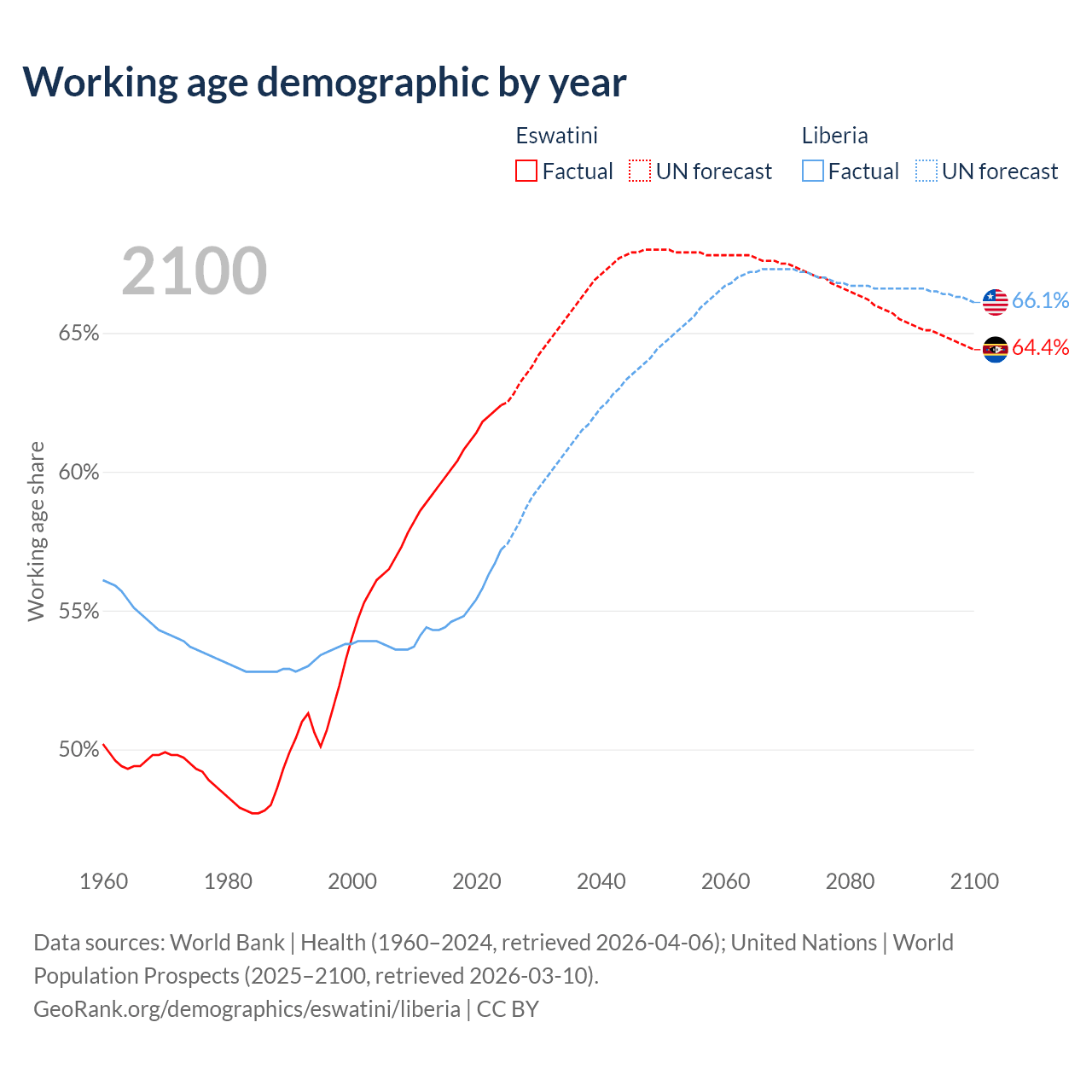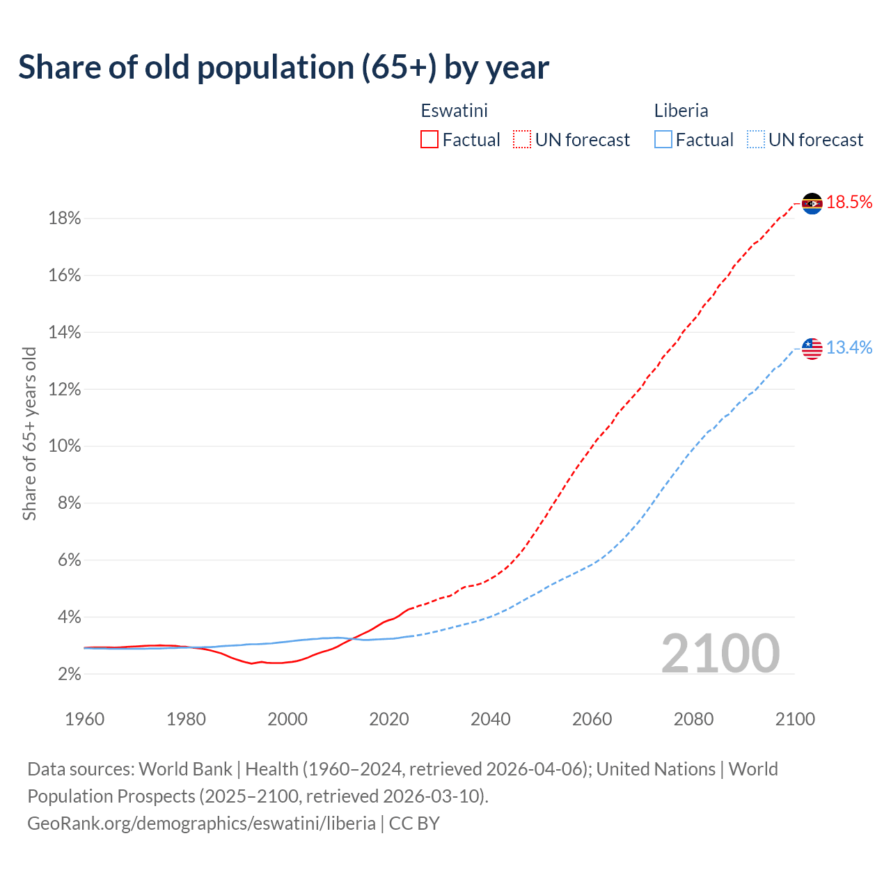 The share of older people aged 65 and over is 4.26% in Eswatini and 3.3% in Liberia. Life expectancy in Eswatini compared to Liberia .