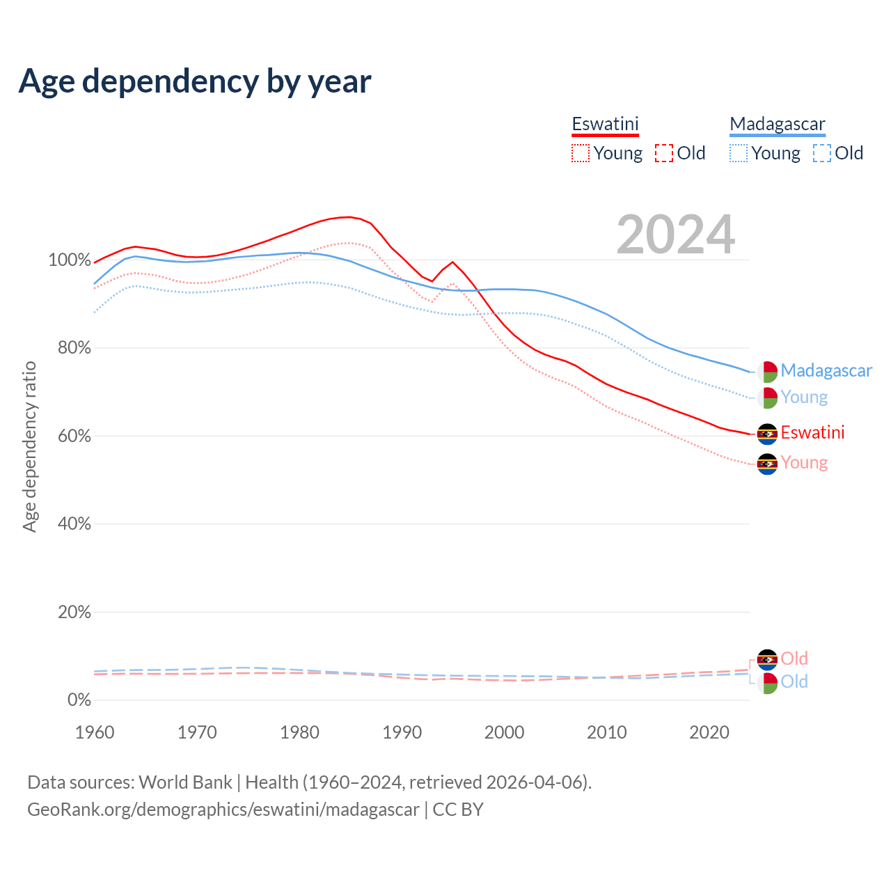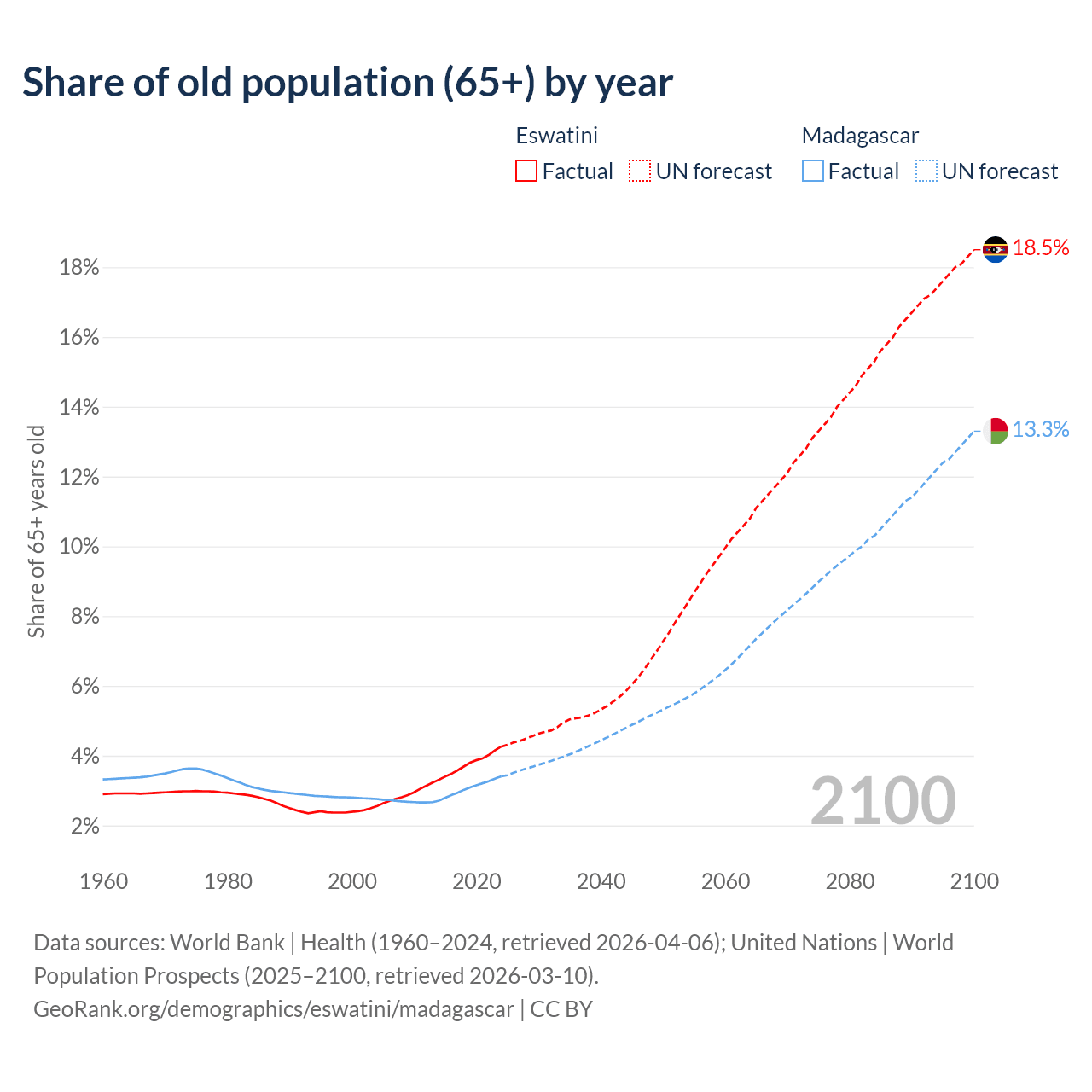 - The share of old-age demographic (65+) in Eswatini is 4.26% vs 3.41% in Madagascar.