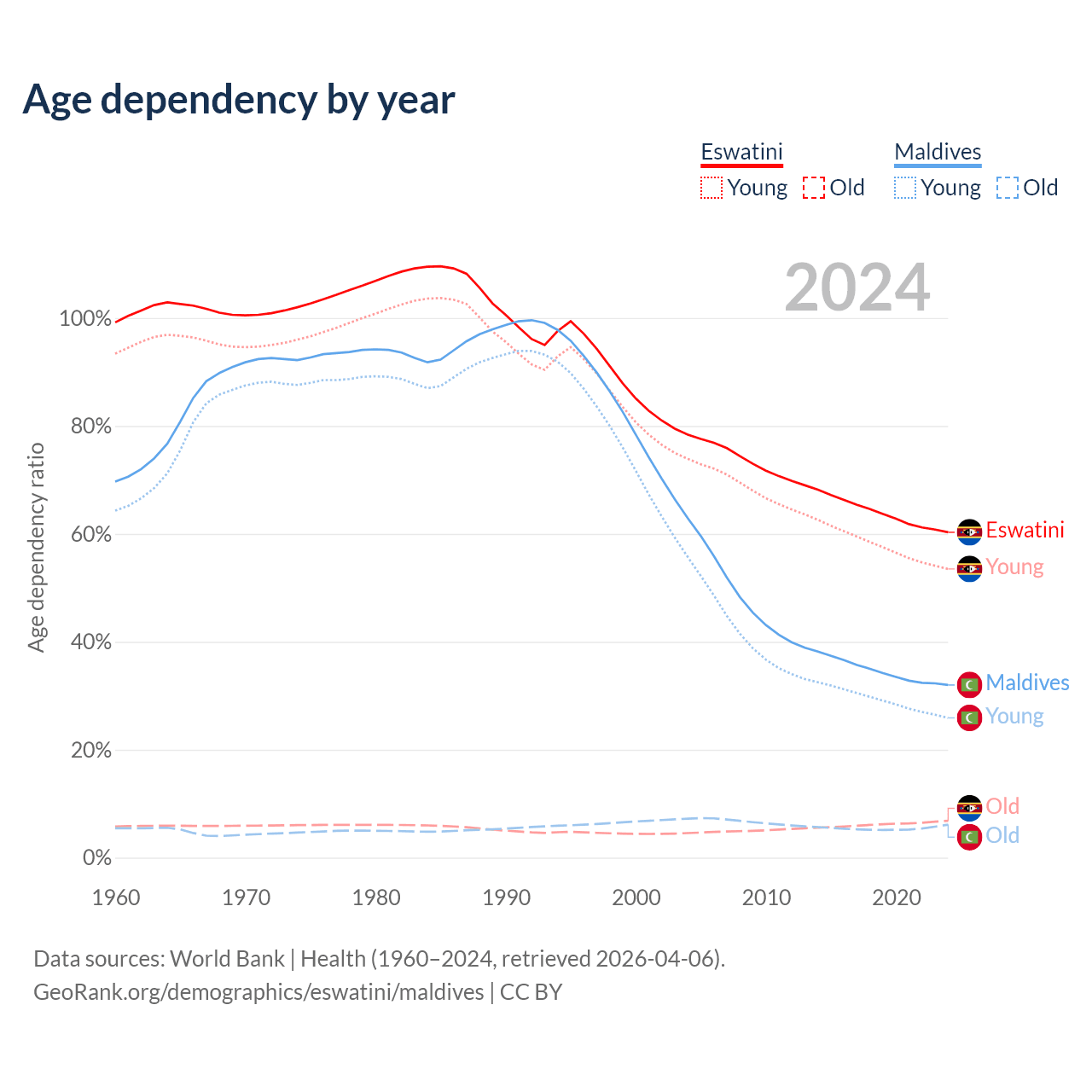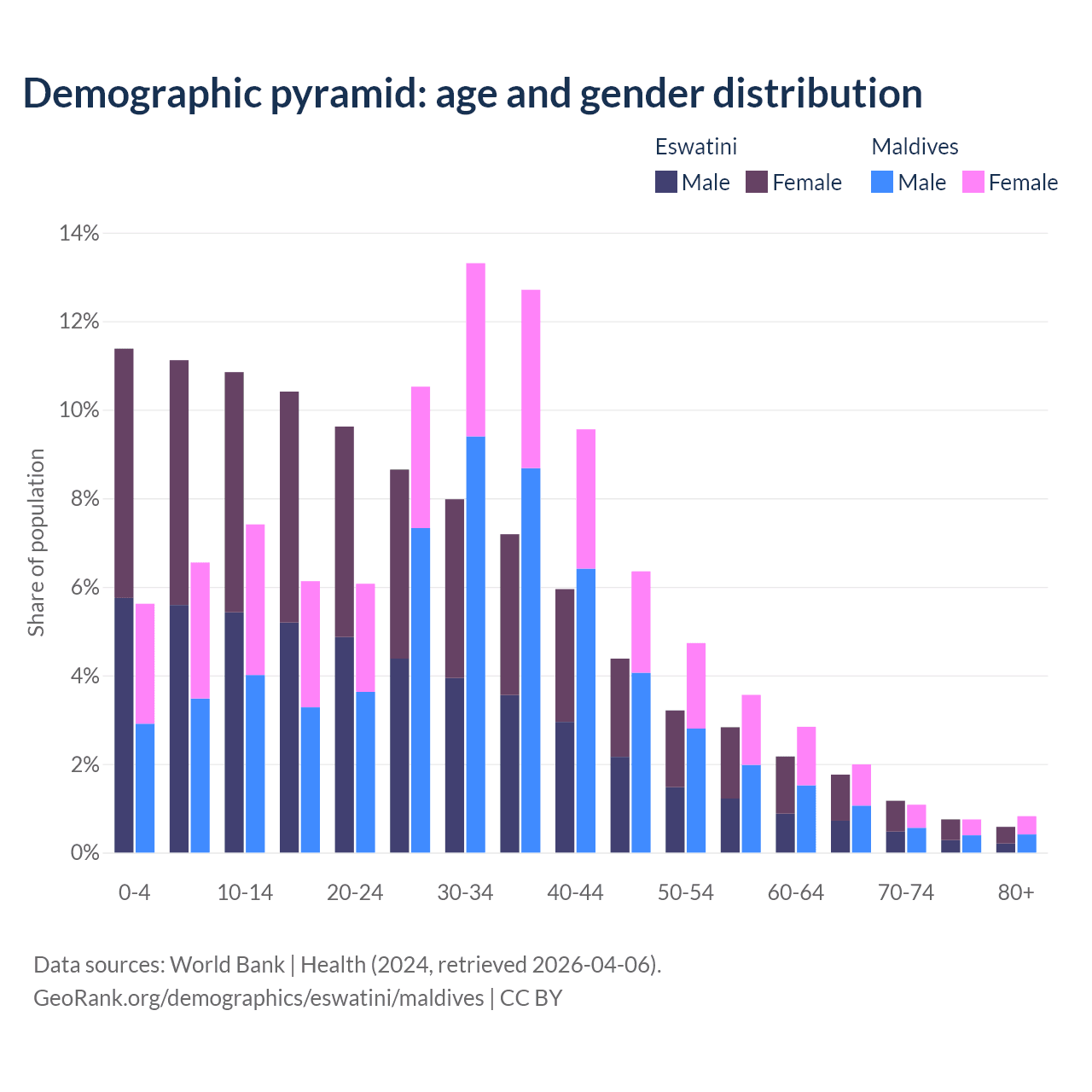 - The share of old-age demographic (65+) in Eswatini is 4.26% vs 4.64% in Maldives.