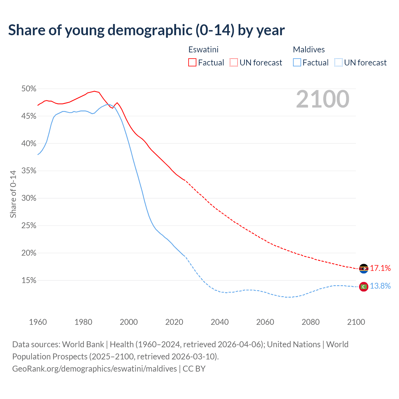 - The share of young demographic (0-15 years old) in Eswatini is 33.4% vs 19.6% in Maldives.