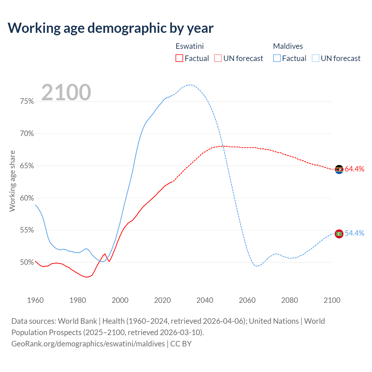 - Eswatini has 794K working age adults (aged 15-64) vs 403K in Maldives.