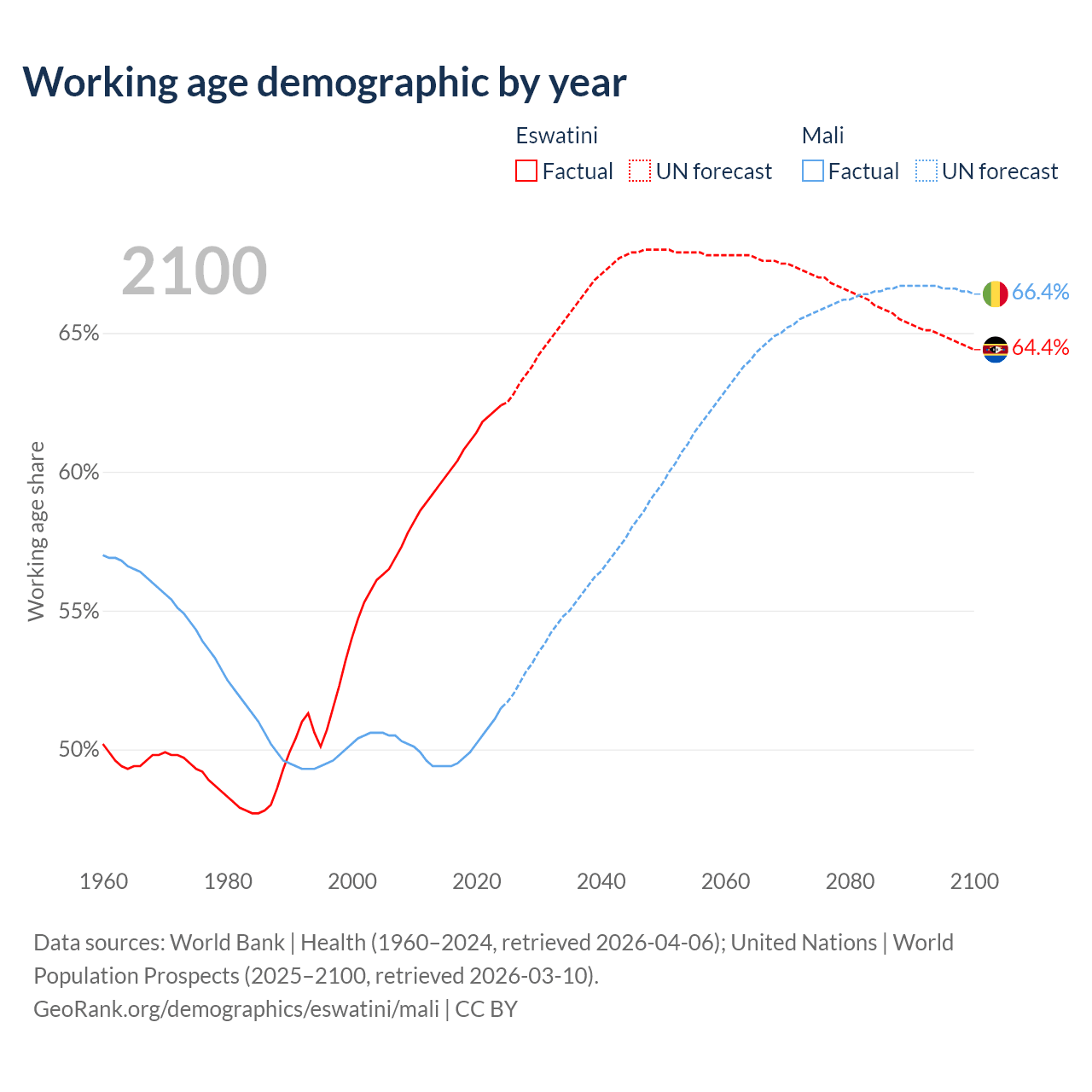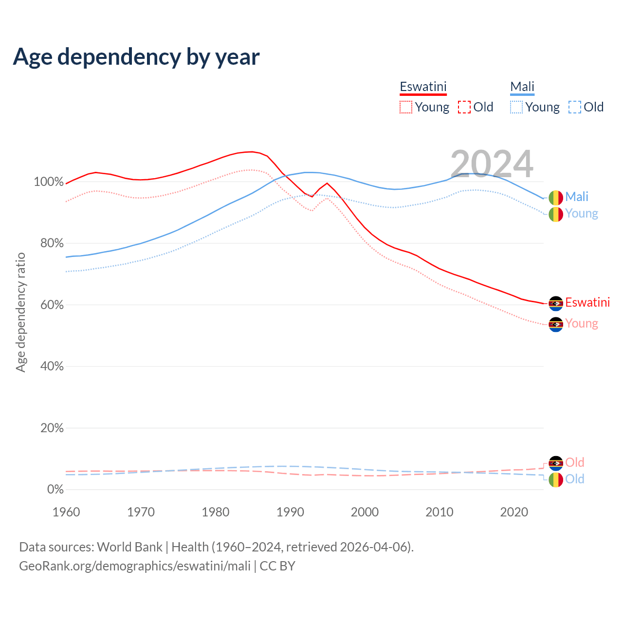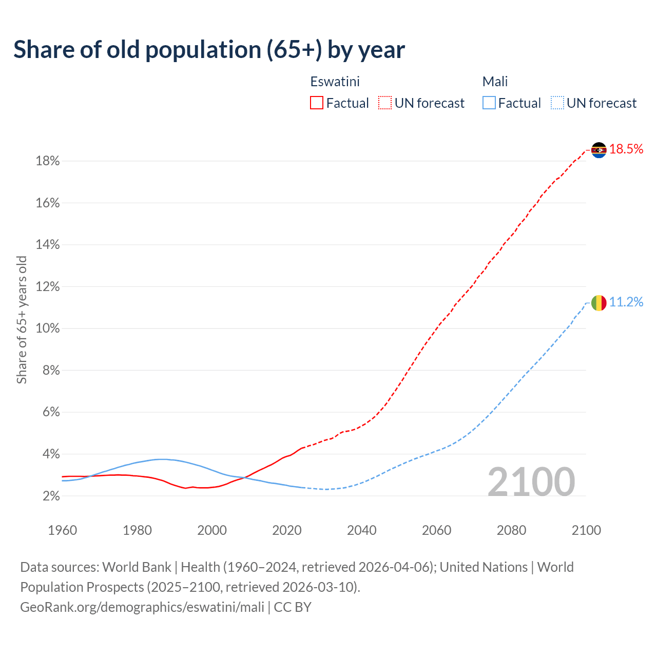 - The share of old-age demographic (65+) in Eswatini is 4.26% vs 2.38% in Mali.
