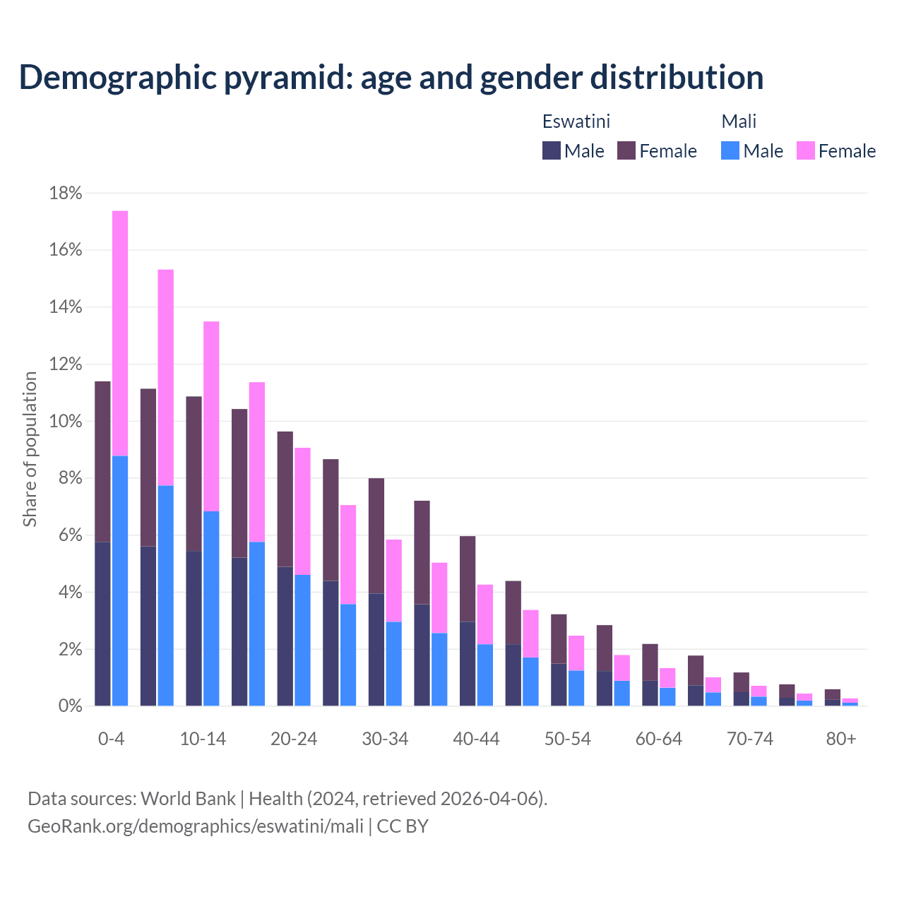 - As of 2026, the population of Eswatini is 1.27M vs 26.1M in Mali - 20.5 times difference.