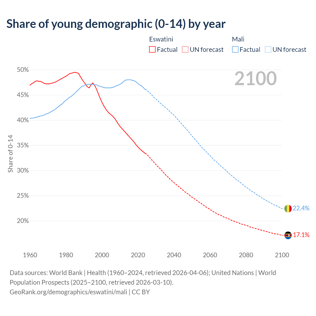 - The share of young demographic (0-15 years old) in Eswatini is 33.4% vs 46.1% in Mali.