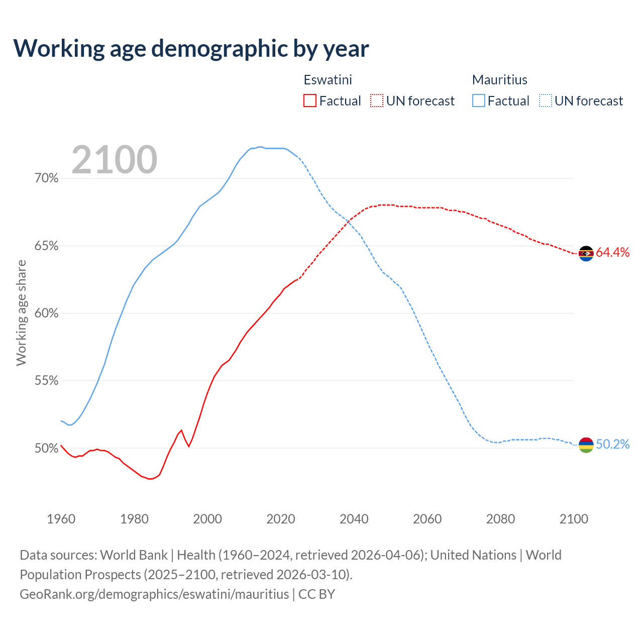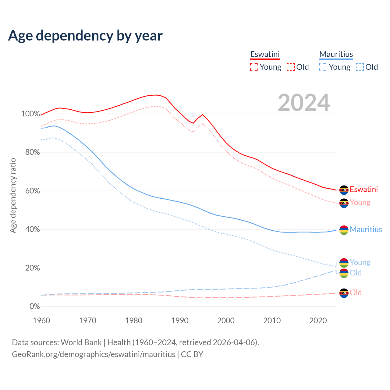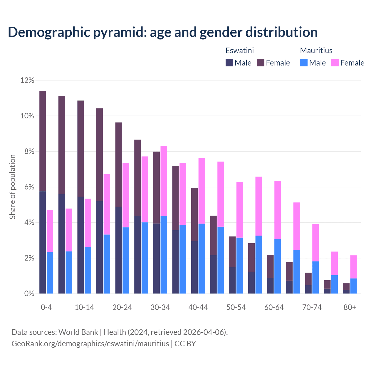 The share of older people aged 65 and over is 4.26% in Eswatini and 13.5% in Mauritius. Life expectancy in Eswatini compared to Mauritius .