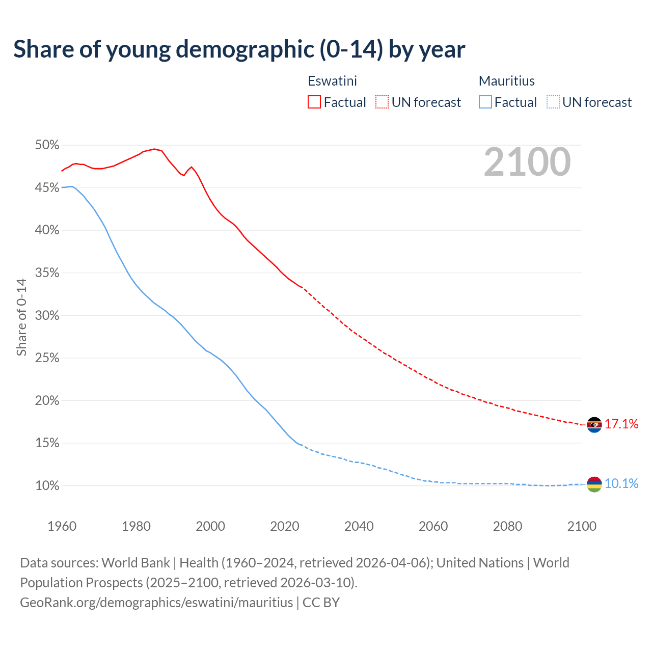 - The share of young demographic (0-15 years old) in Eswatini is 33.4% vs 14.8% in Mauritius.