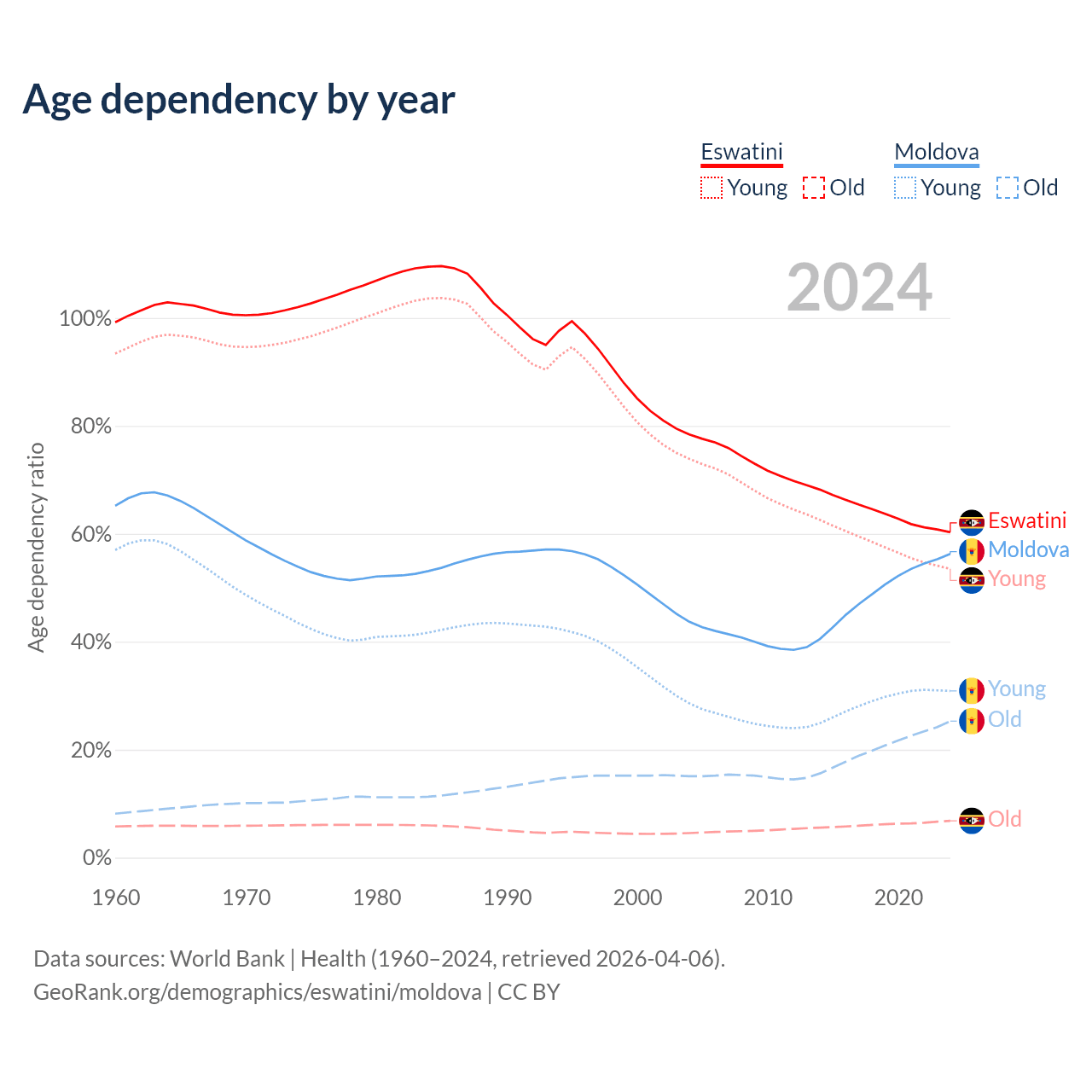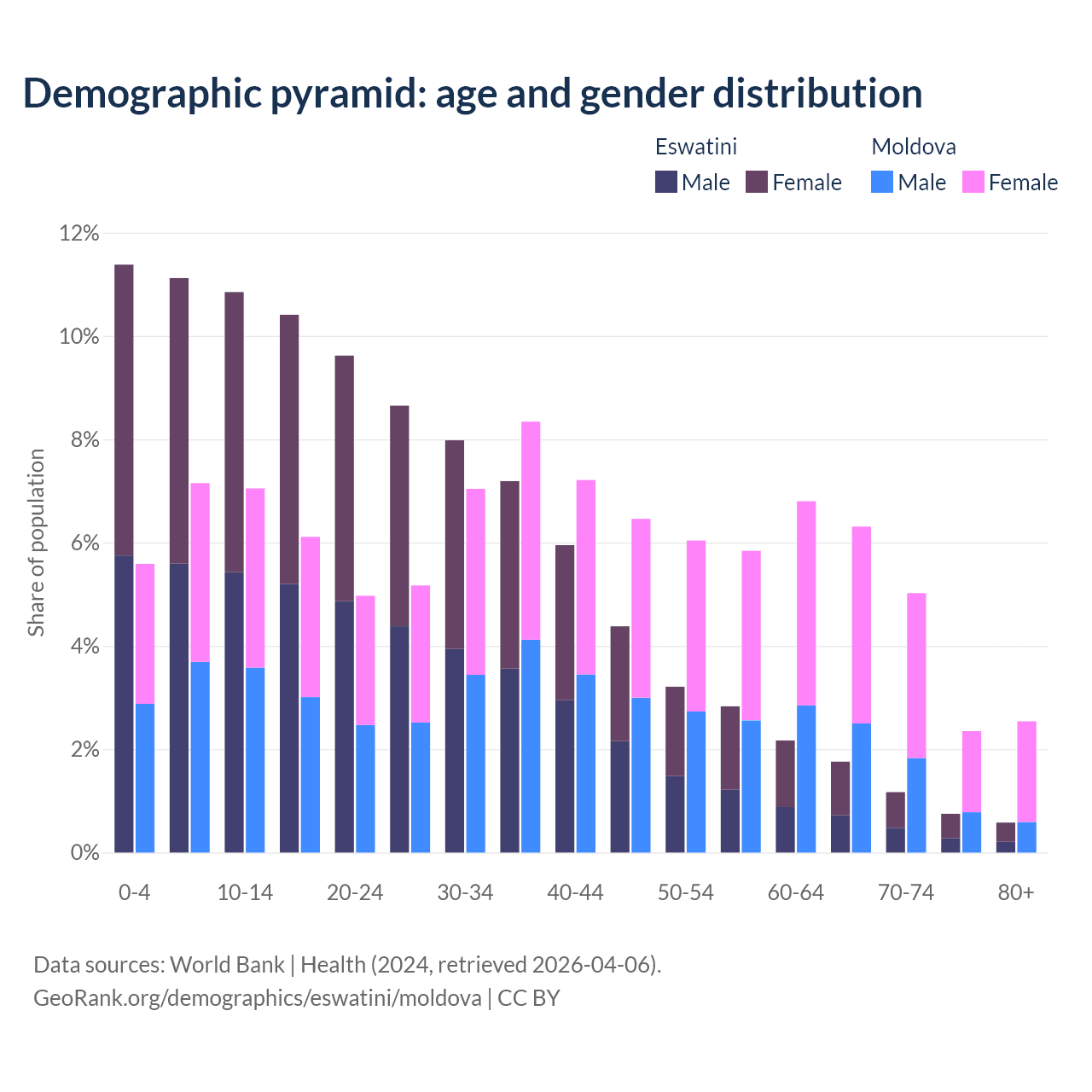 - Eswatini is ranked 141/196 by median age (oldest to youngest) vs 54/196 for Moldova.