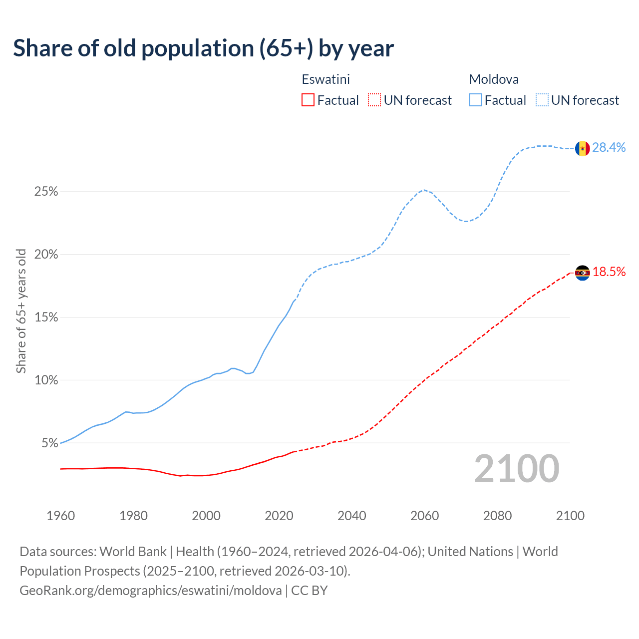 The share of older people aged 65 and over is 4.26% in Eswatini and 16.2% in Moldova. Life expectancy in Eswatini compared to Moldova .