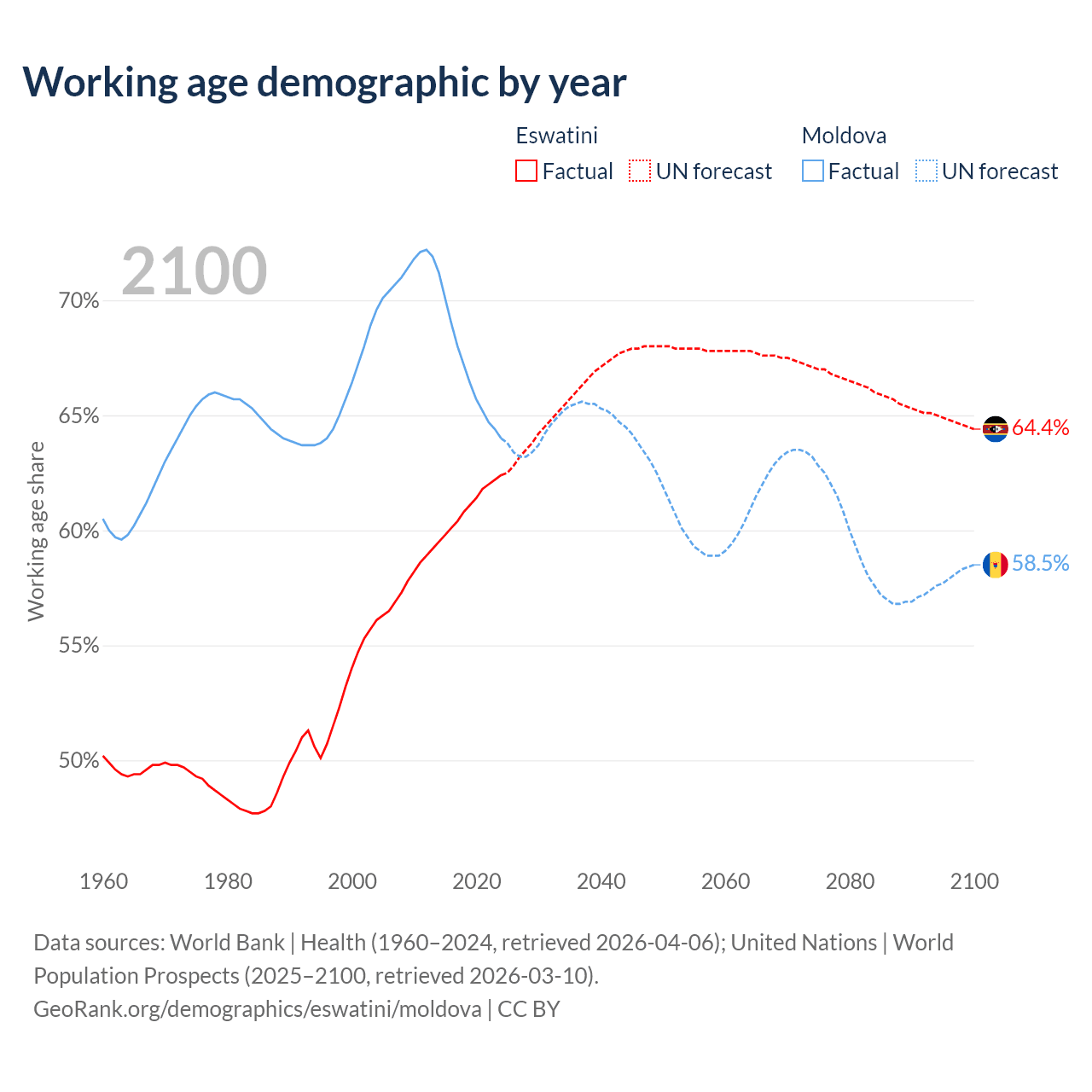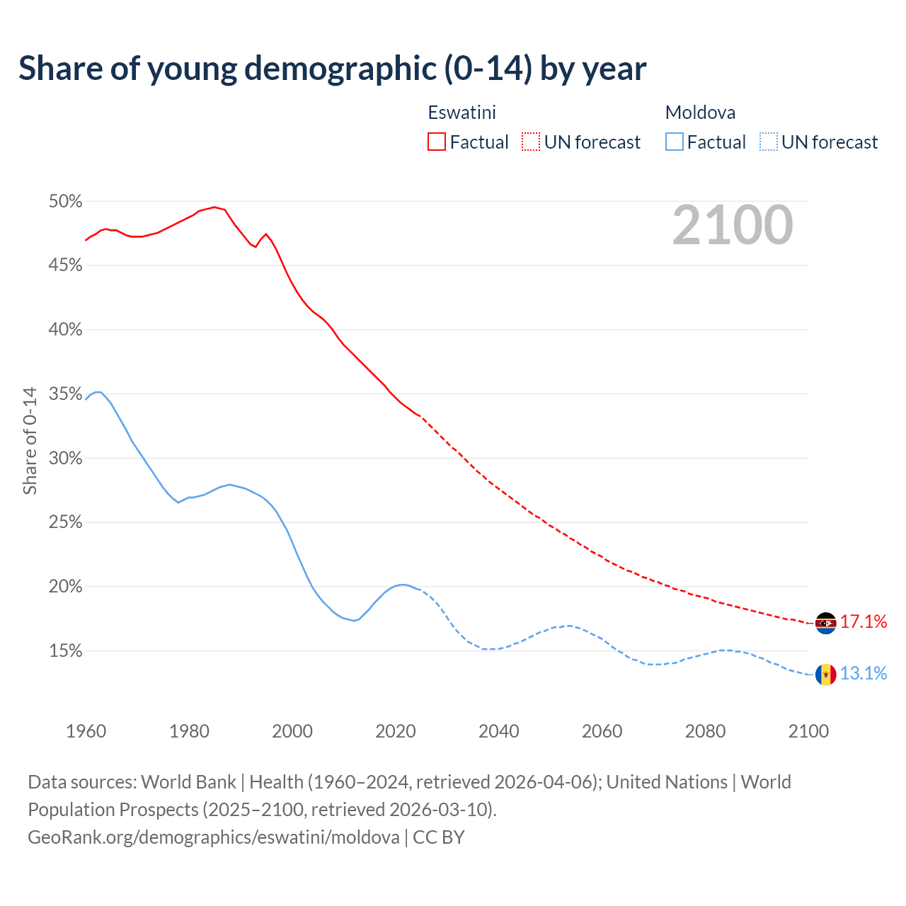 - The share of young demographic (0-15 years old) in Eswatini is 33.4% vs 19.8% in Moldova.