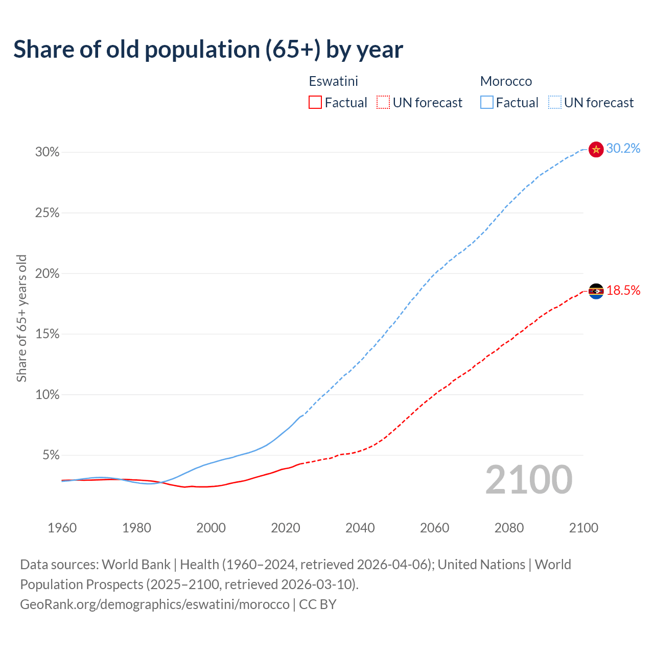 - The share of old-age demographic (65+) in Eswatini is 4.26% vs 8.14% in Morocco.