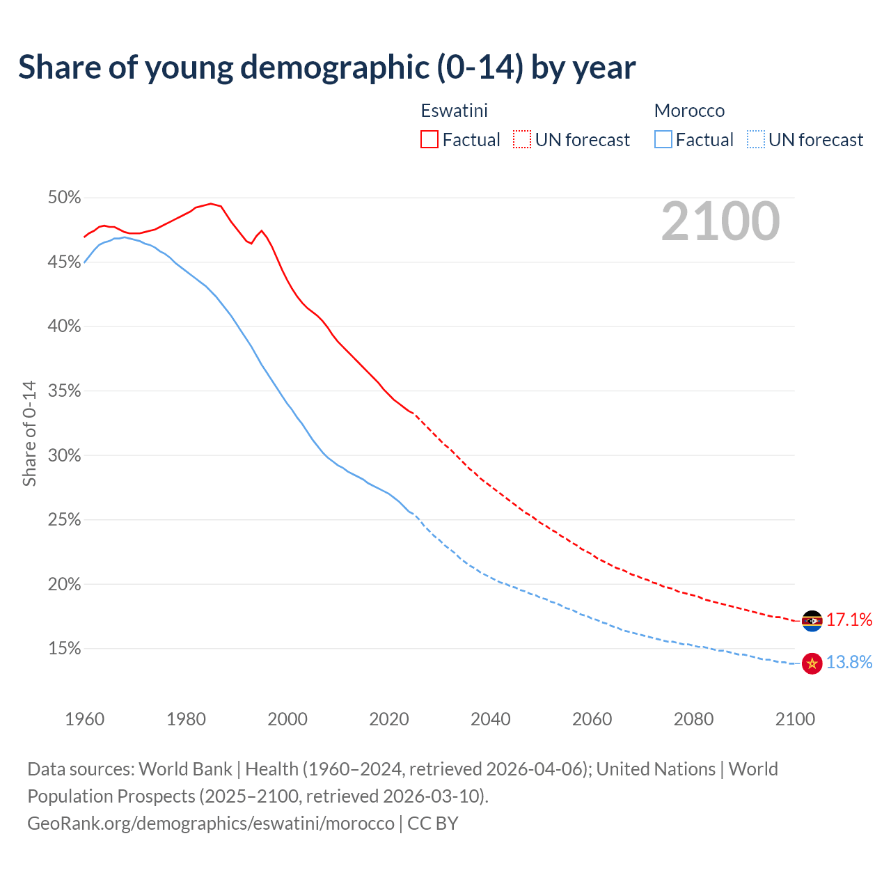 - The share of young demographic (0-15 years old) in Eswatini is 33.4% vs 25.6% in Morocco.