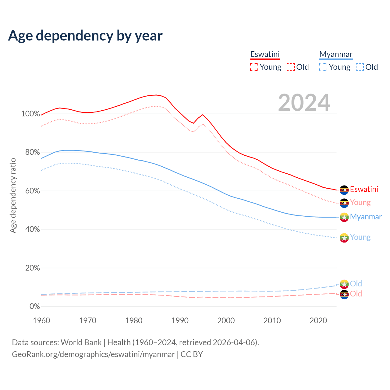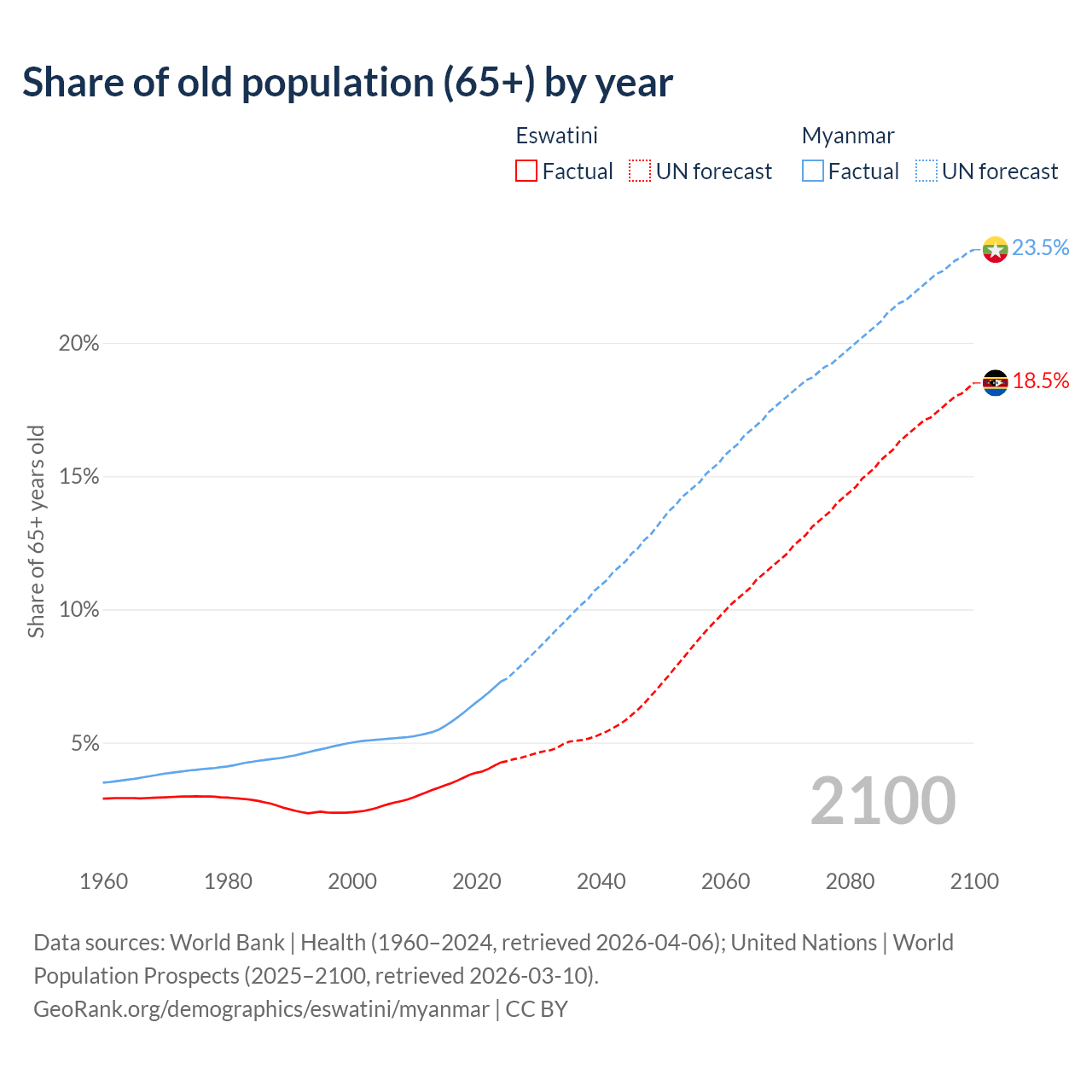 The share of older people aged 65 and over is 4.26% in Eswatini and 7.3% in Myanmar. Life expectancy in Eswatini compared to Myanmar .