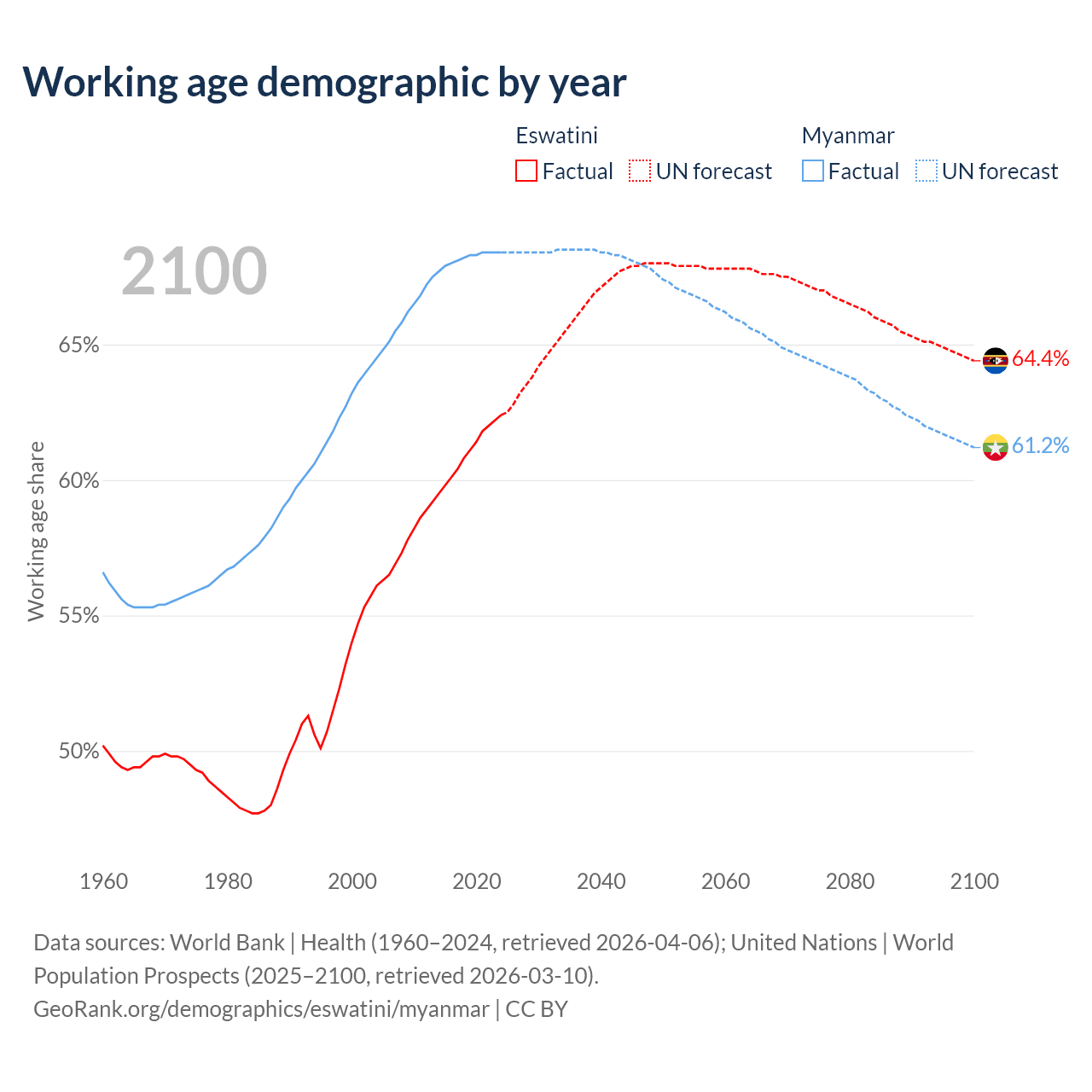 - Eswatini has 794K working age adults (aged 15-64) vs 37.8M in Myanmar.