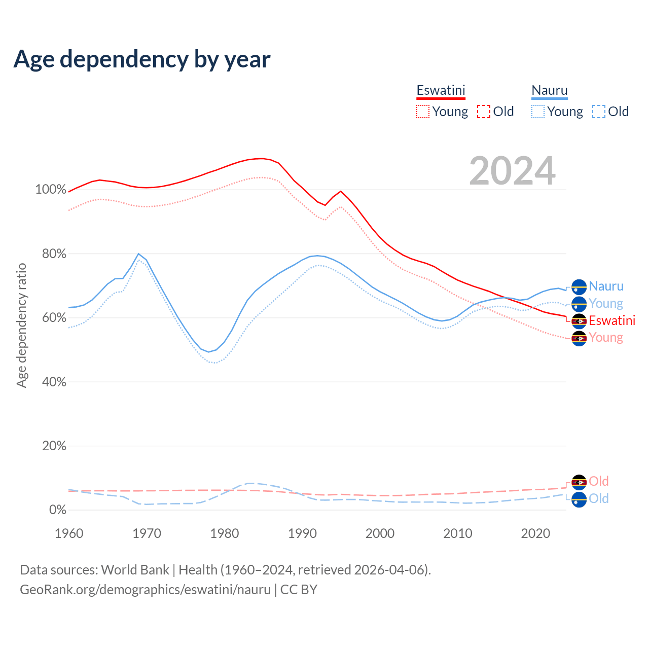 The share of older people aged 65 and over is 4.26% in Eswatini and 2.85% in Nauru. Life expectancy in Eswatini compared to Nauru .