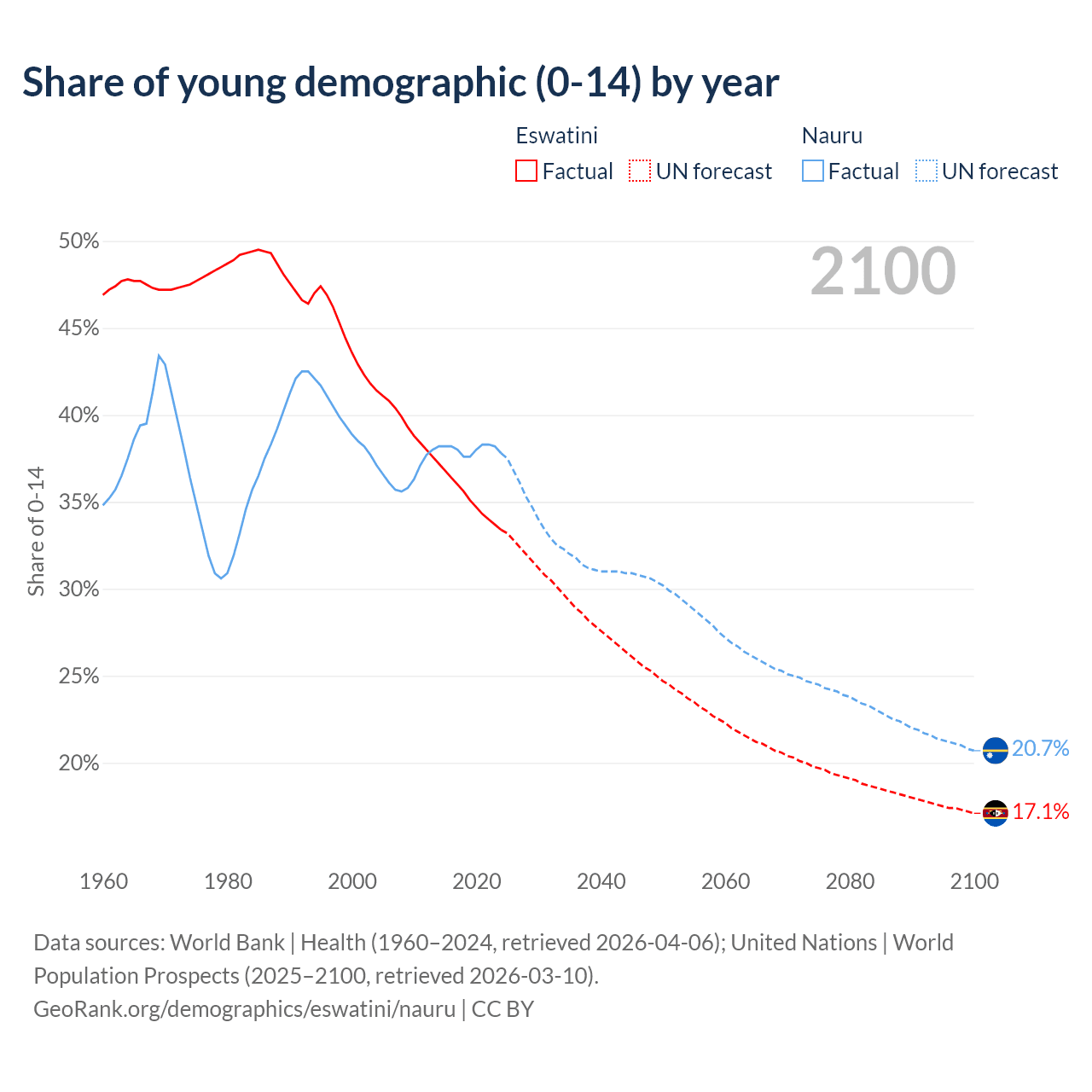 - The share of young demographic (0-15 years old) in Eswatini is 33.4% vs 37.8% in Nauru.
