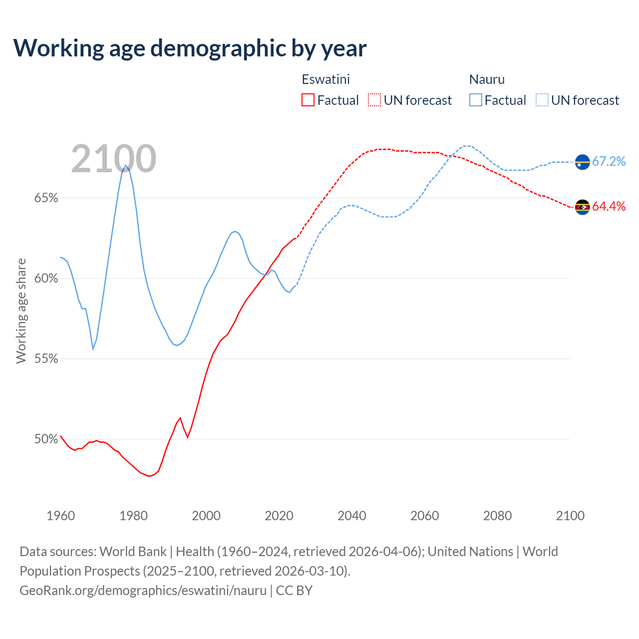 - Eswatini has 794K working age adults (aged 15-64) vs 7.2K in Nauru.