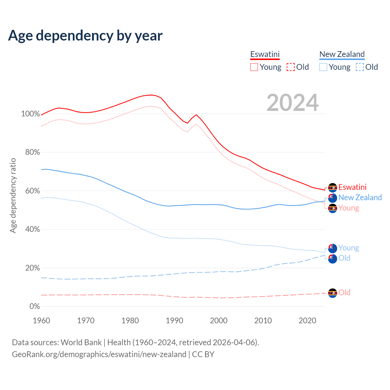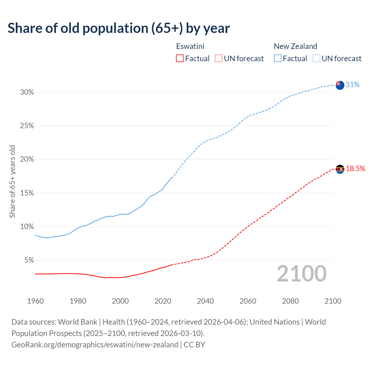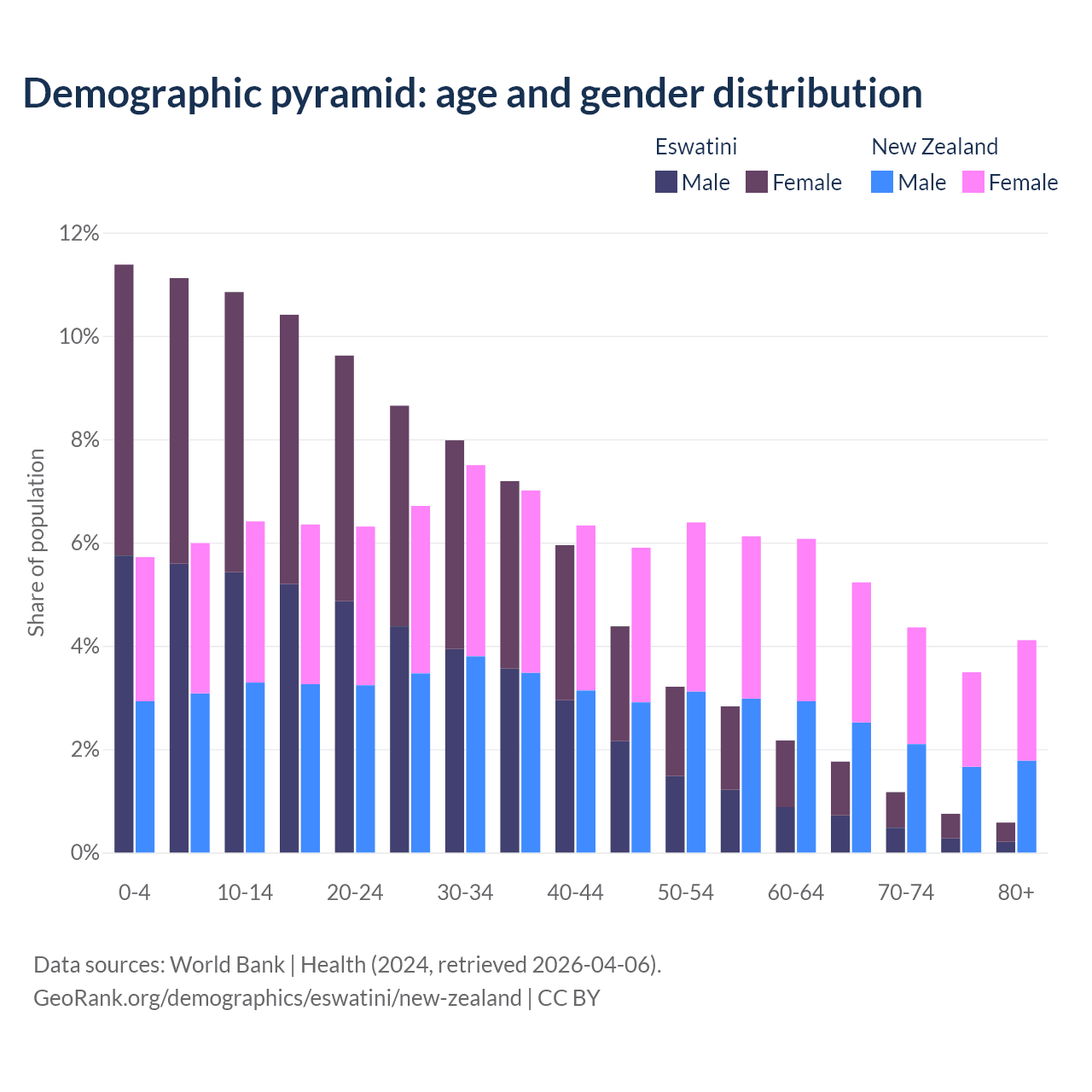 - The share of old-age demographic (65+) in Eswatini is 4.26% vs 17.2% in New Zealand.