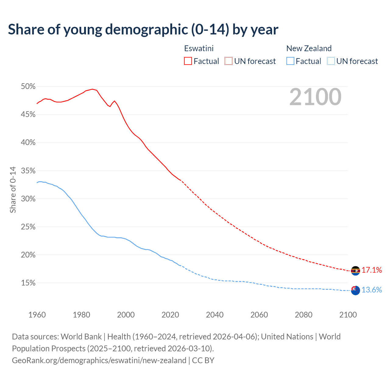 - The share of young demographic (0-15 years old) in Eswatini is 33.4% vs 18.1% in New Zealand.