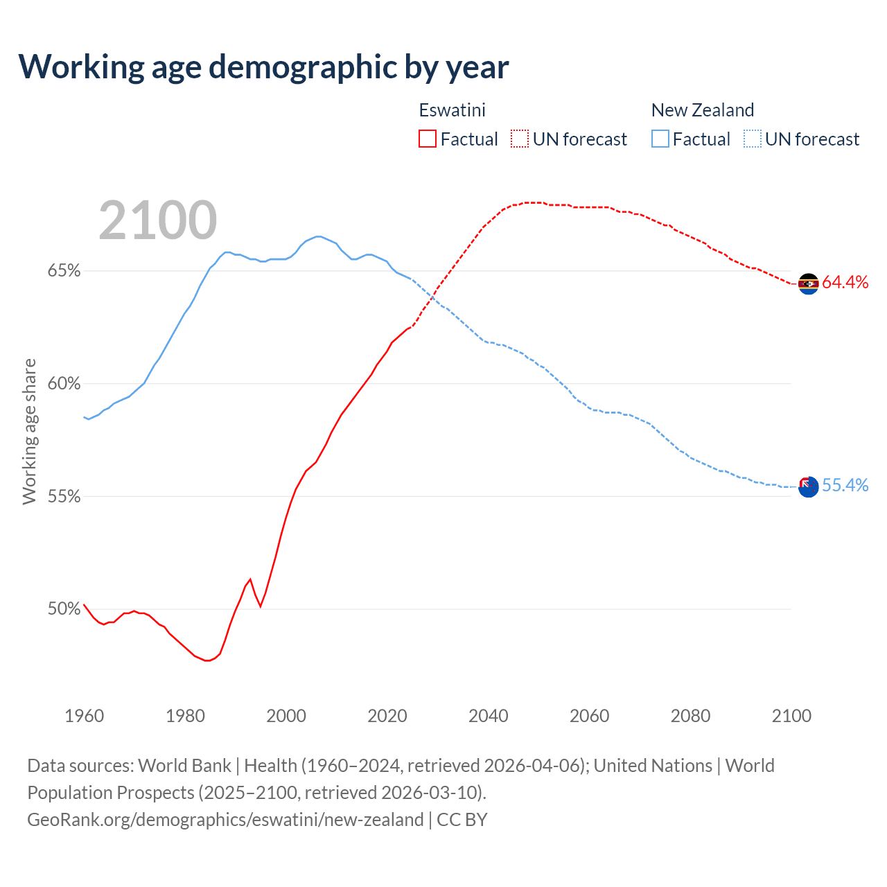 - Eswatini has 794K working age adults (aged 15-64) vs 3.48M in New Zealand.