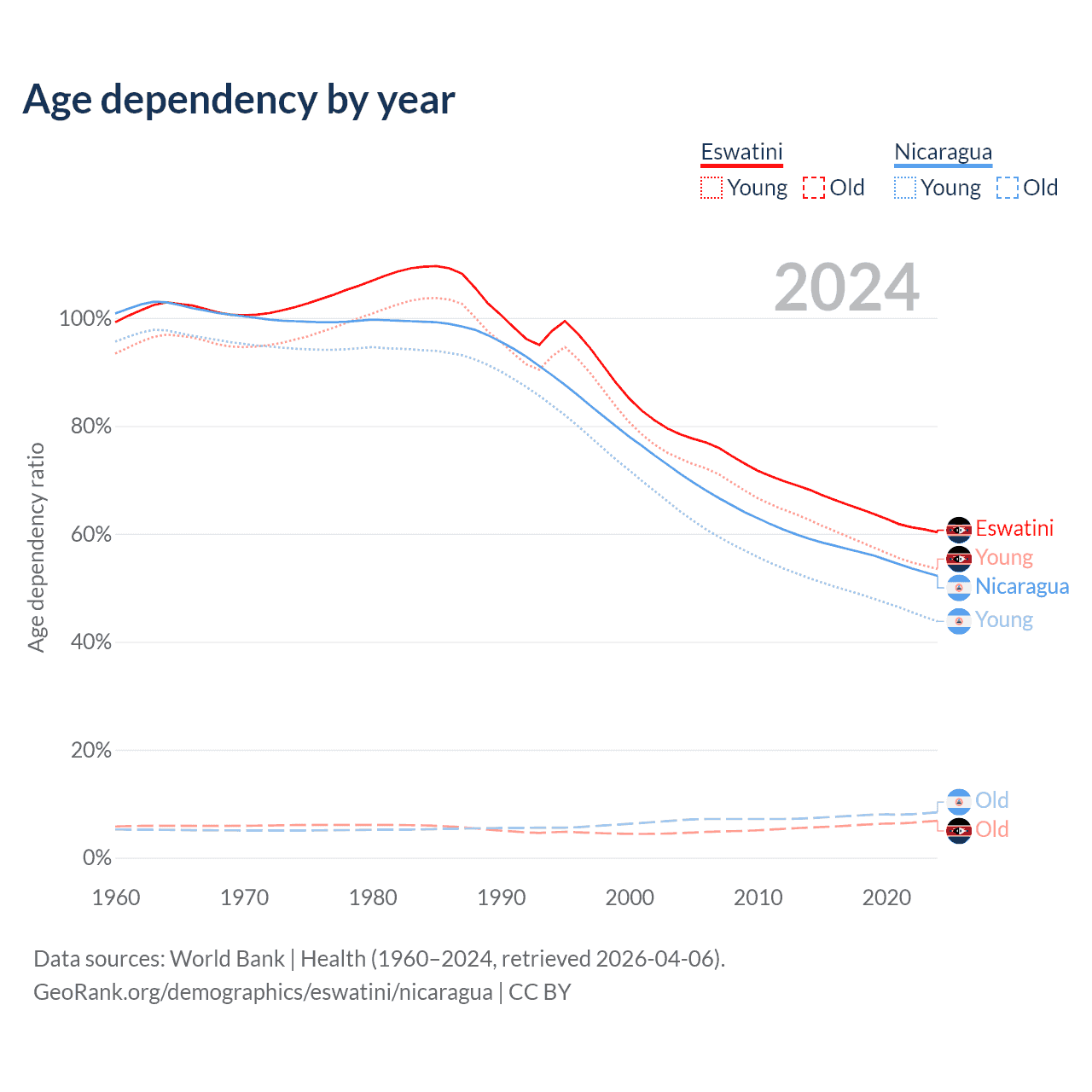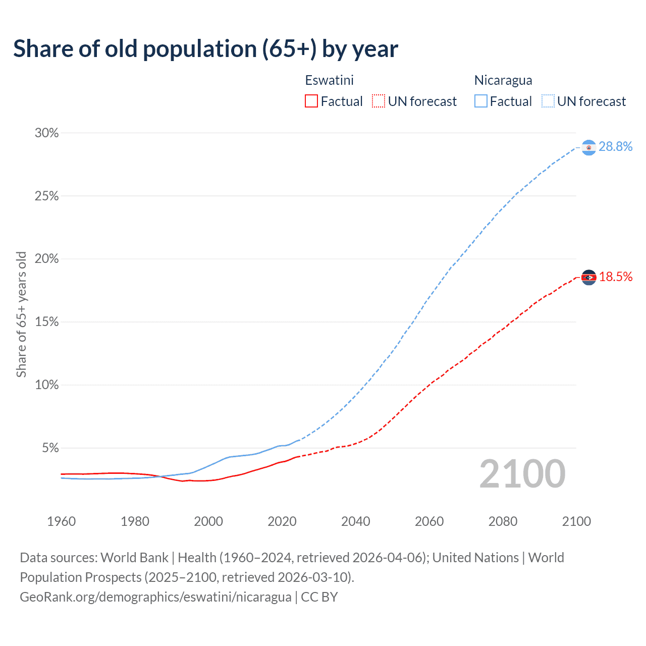 - The share of old-age demographic (65+) in Eswatini is 4.26% vs 5.53% in Nicaragua.