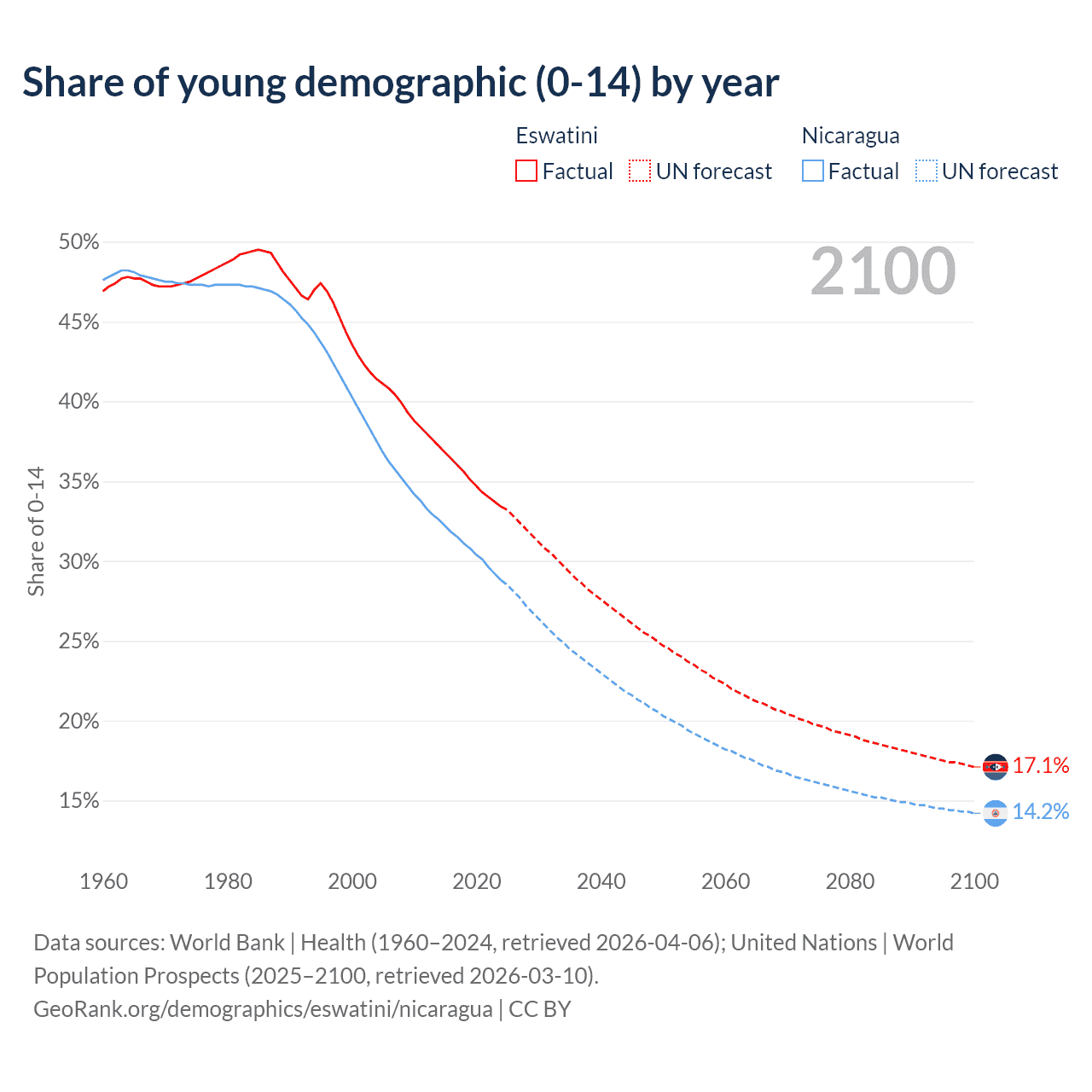 - The share of young demographic (0-15 years old) in Eswatini is 33.4% vs 28.8% in Nicaragua.