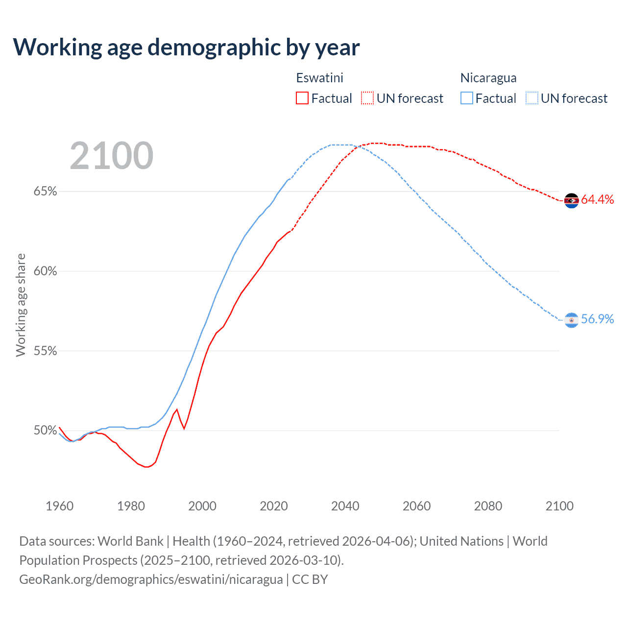 - Eswatini has 794K working age adults (aged 15-64) vs 4.68M in Nicaragua.