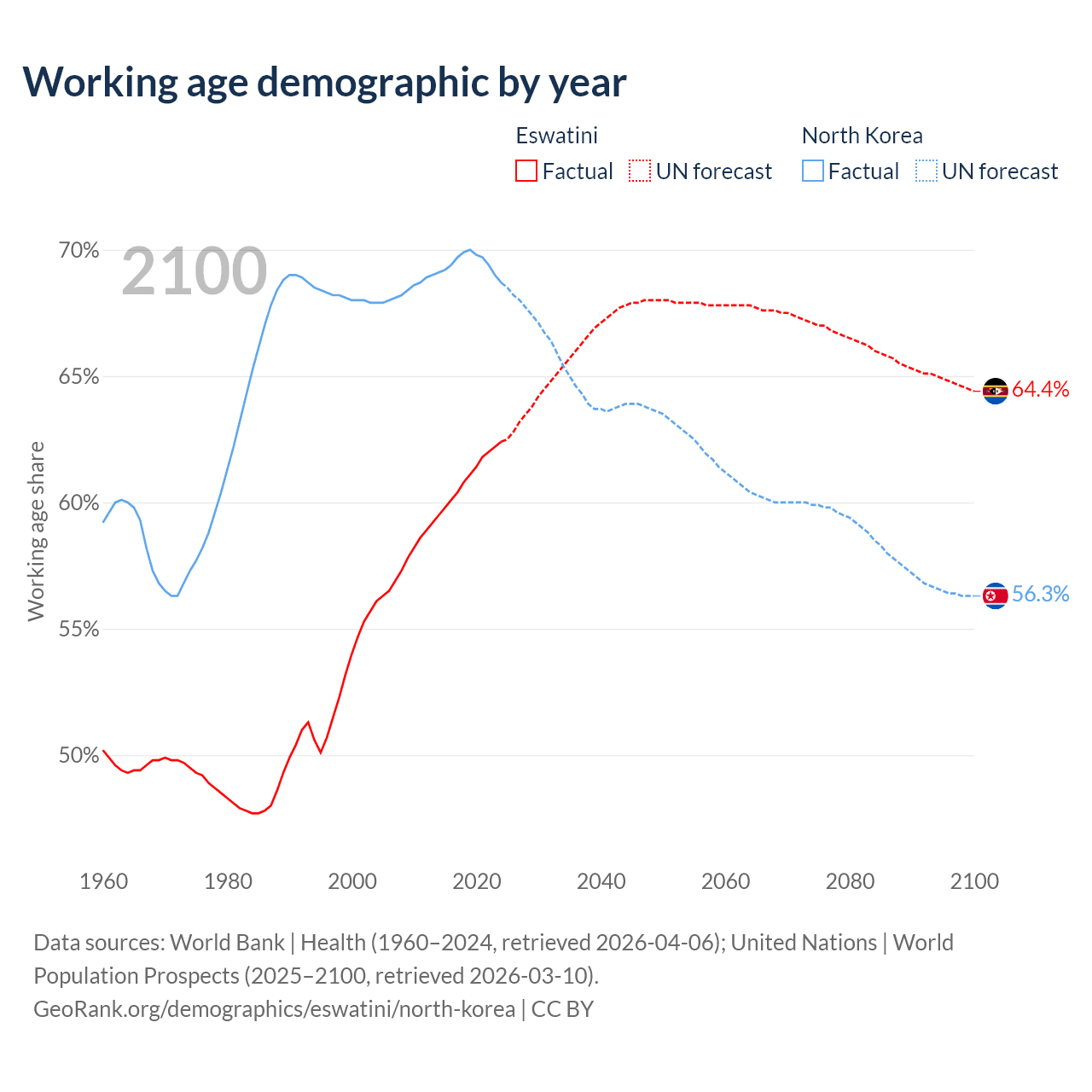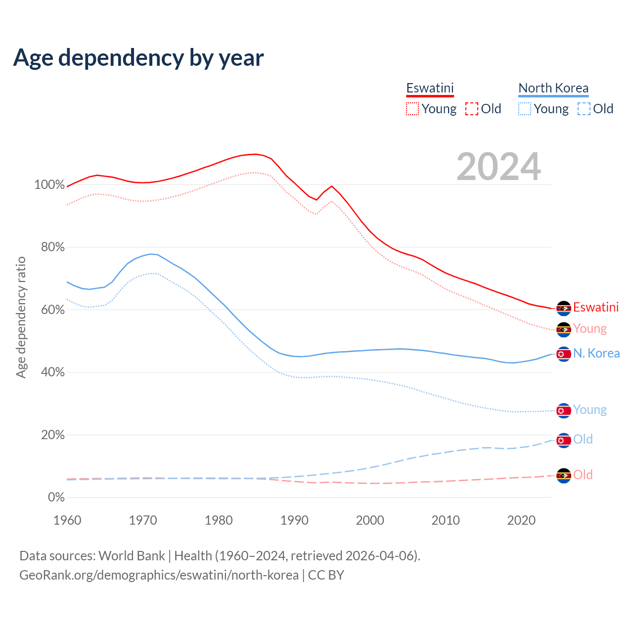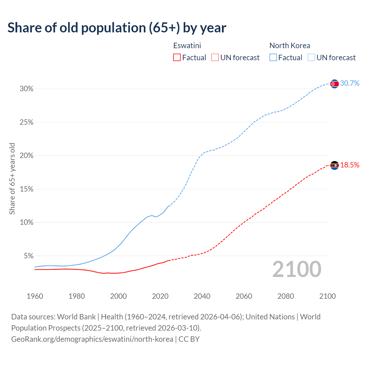 The share of older people aged 65 and over is 4.26% in Eswatini and 12.4% in North Korea. Life expectancy in Eswatini compared to North Korea .