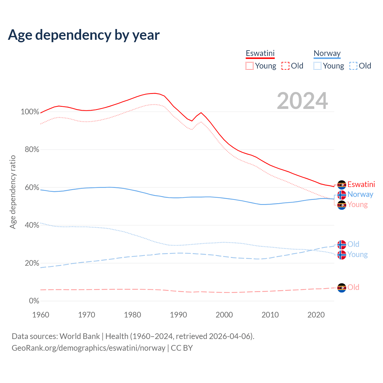 The share of older people aged 65 and over is 4.26% in Eswatini and 18.8% in Norway. Life expectancy in Eswatini compared to Norway .