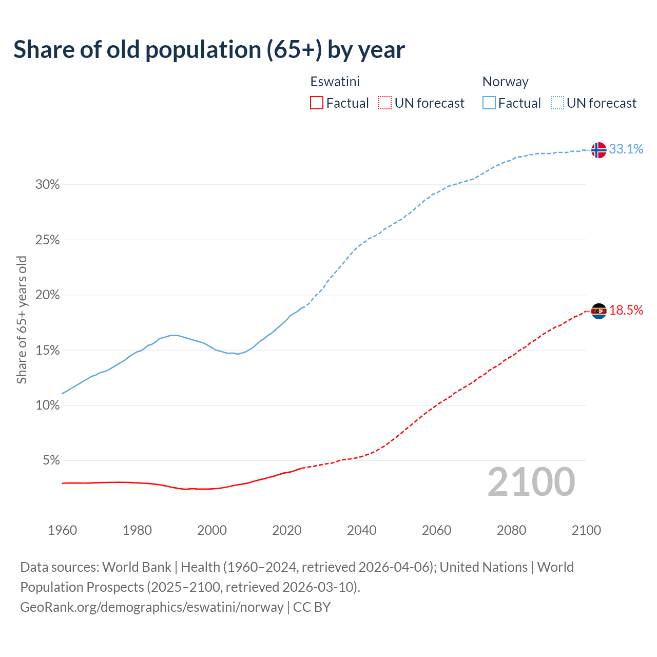 - The share of old-age demographic (65+) in Eswatini is 4.26% vs 18.8% in Norway.