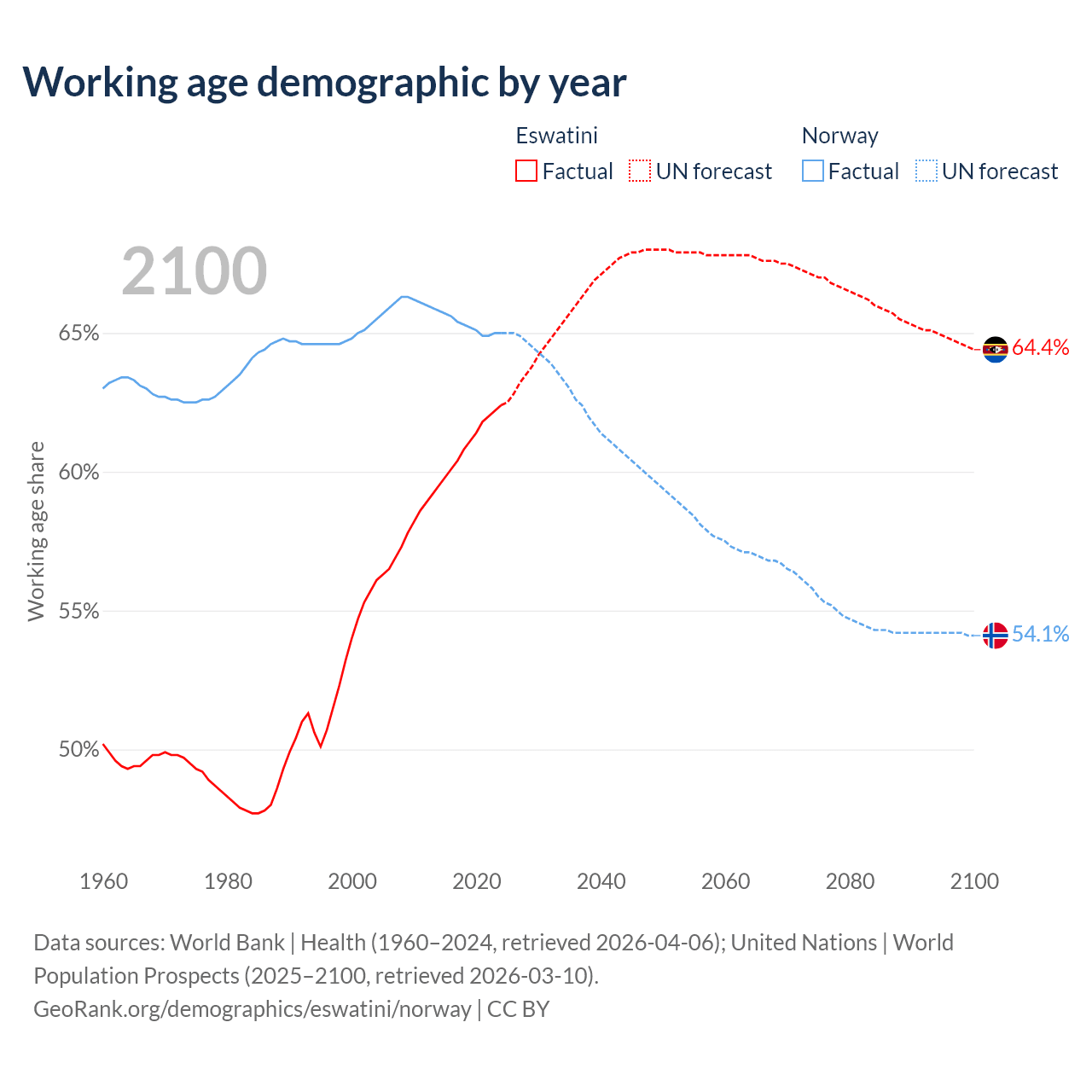 - Eswatini has 794K working age adults (aged 15-64) vs 3.69M in Norway.