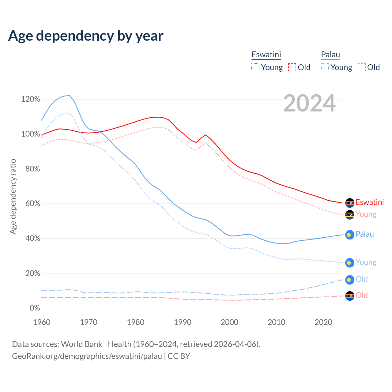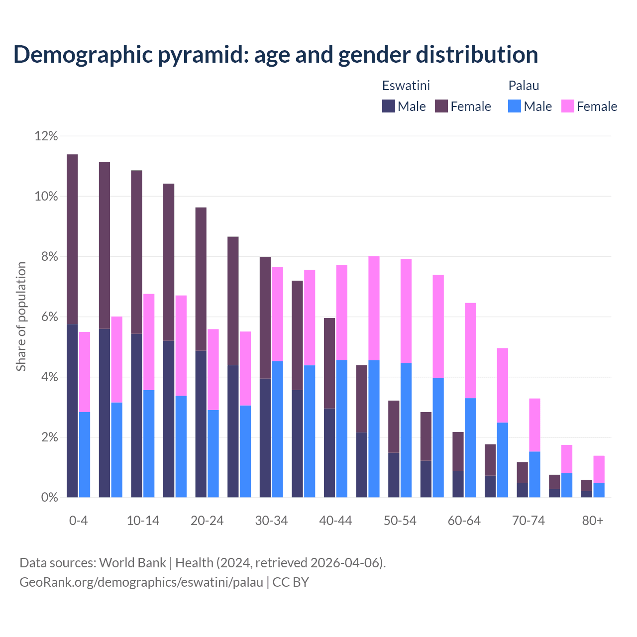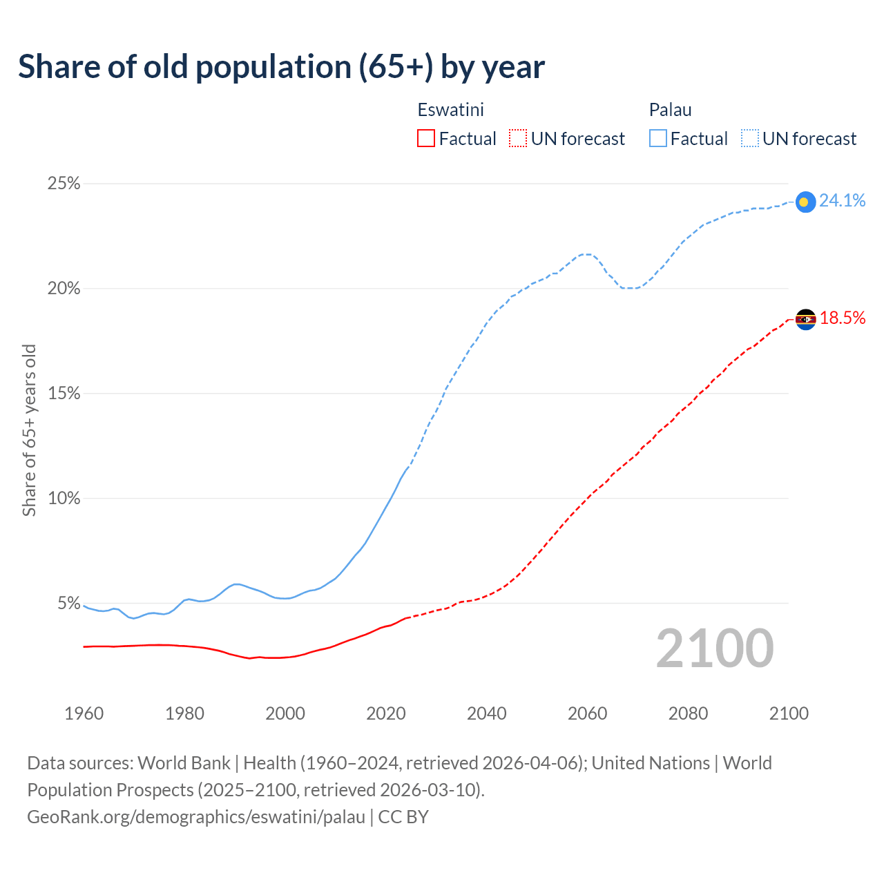 - The share of old-age demographic (65+) in Eswatini is 4.26% vs 11.3% in Palau.