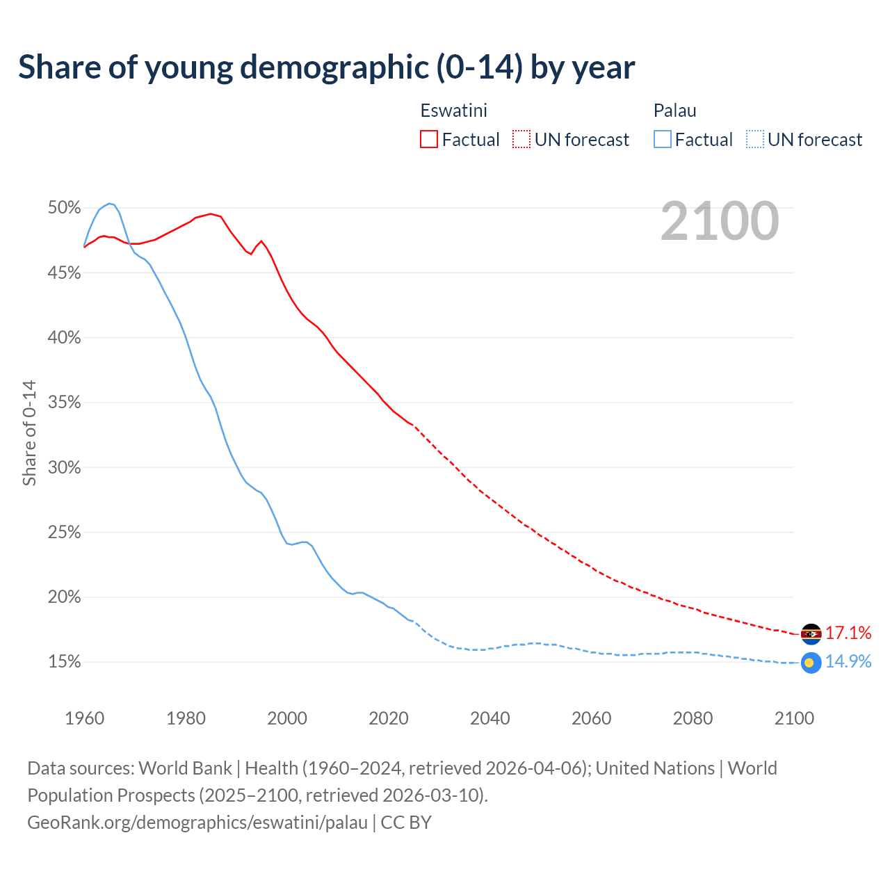 - The share of young demographic (0-15 years old) in Eswatini is 33.4% vs 18.2% in Palau.