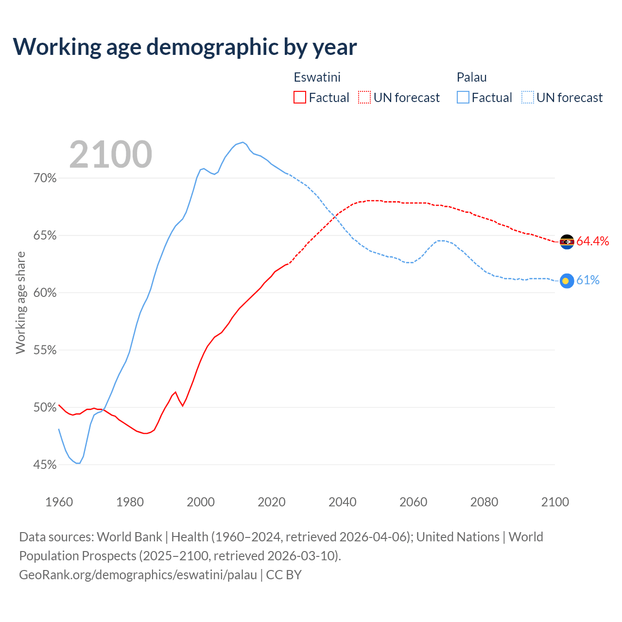 - Eswatini has 794K working age adults (aged 15-64) vs 12.4K in Palau.