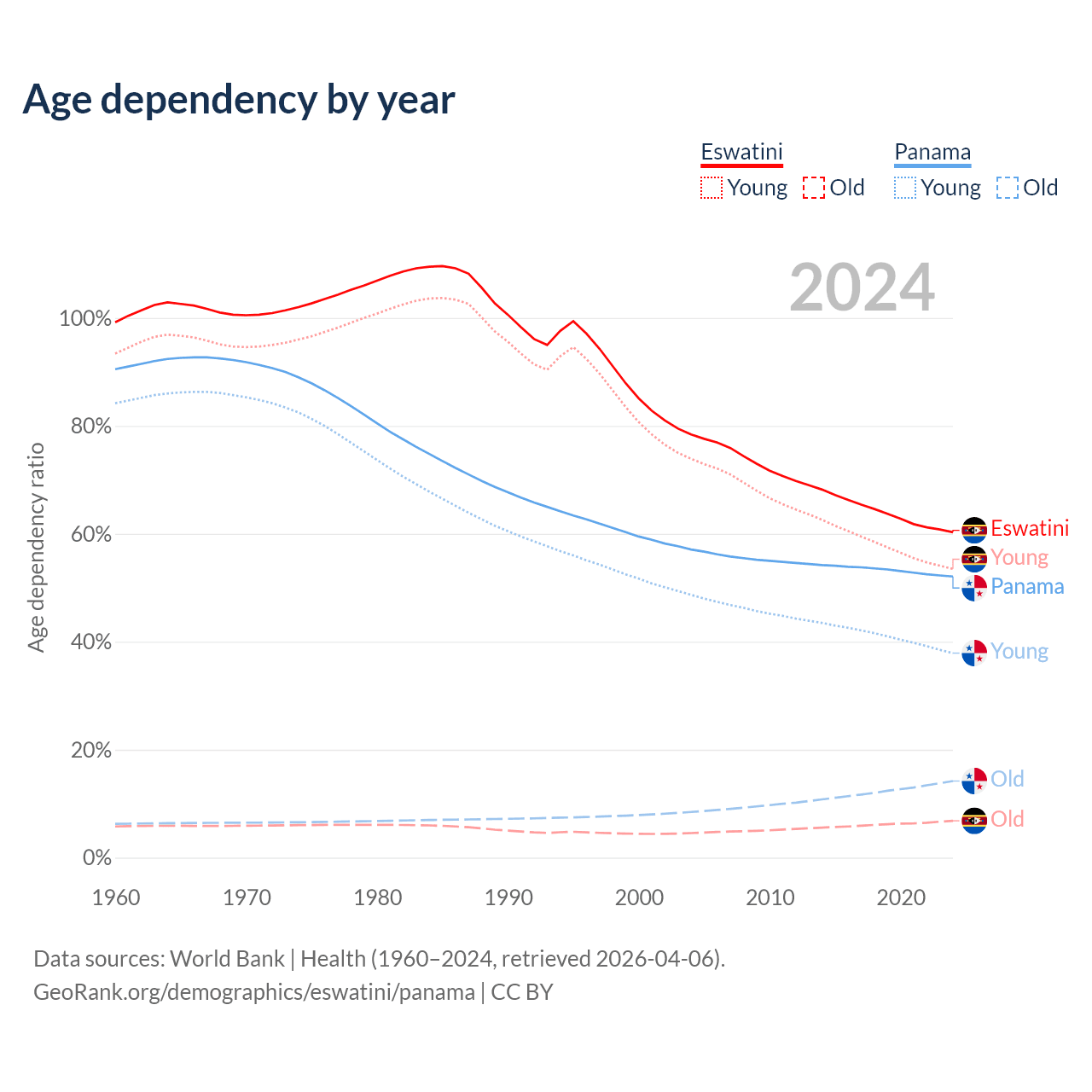 The share of older people aged 65 and over is 4.26% in Eswatini and 9.35% in Panama. Life expectancy in Eswatini compared to Panama .