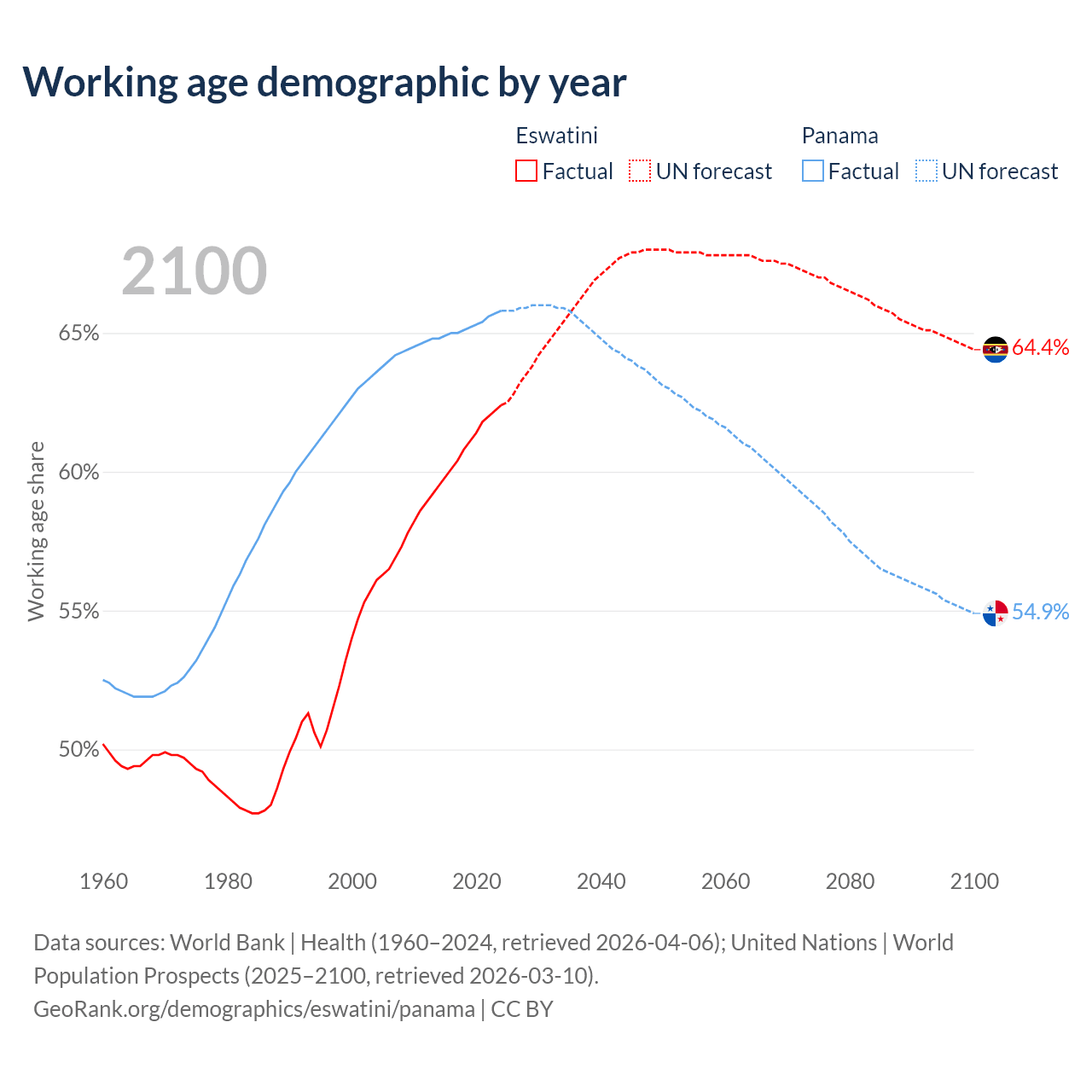 Median age Eswatini vs Panama, 1960-2100