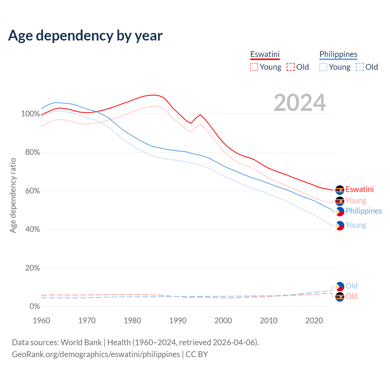 - The share of old-age demographic (65+) in Eswatini is 4.26% vs 5.49% in the Philippines.