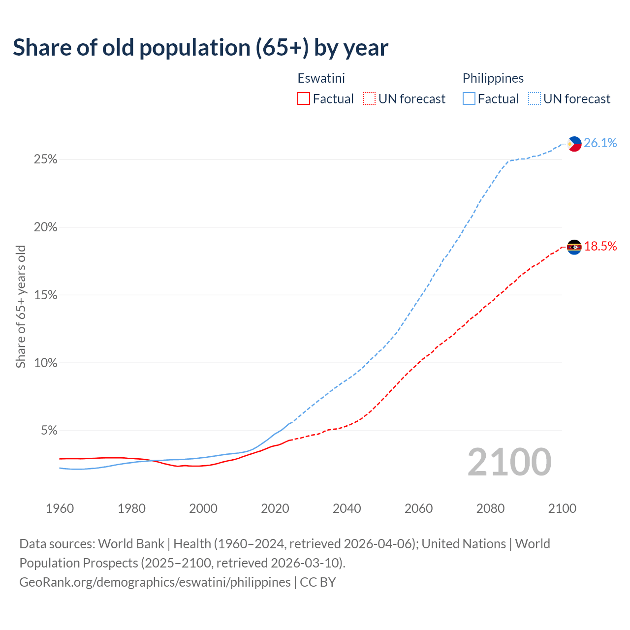 The share of older people aged 65 and over is 4.26% in Eswatini and 5.49% in the Philippines. Life expectancy in Eswatini compared to the Philippines .