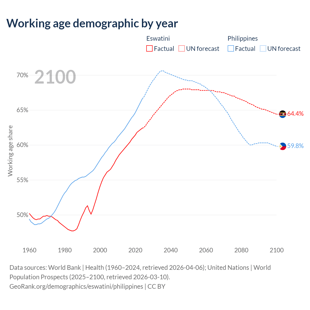 Median age Eswatini vs Philippines, 1960-2100