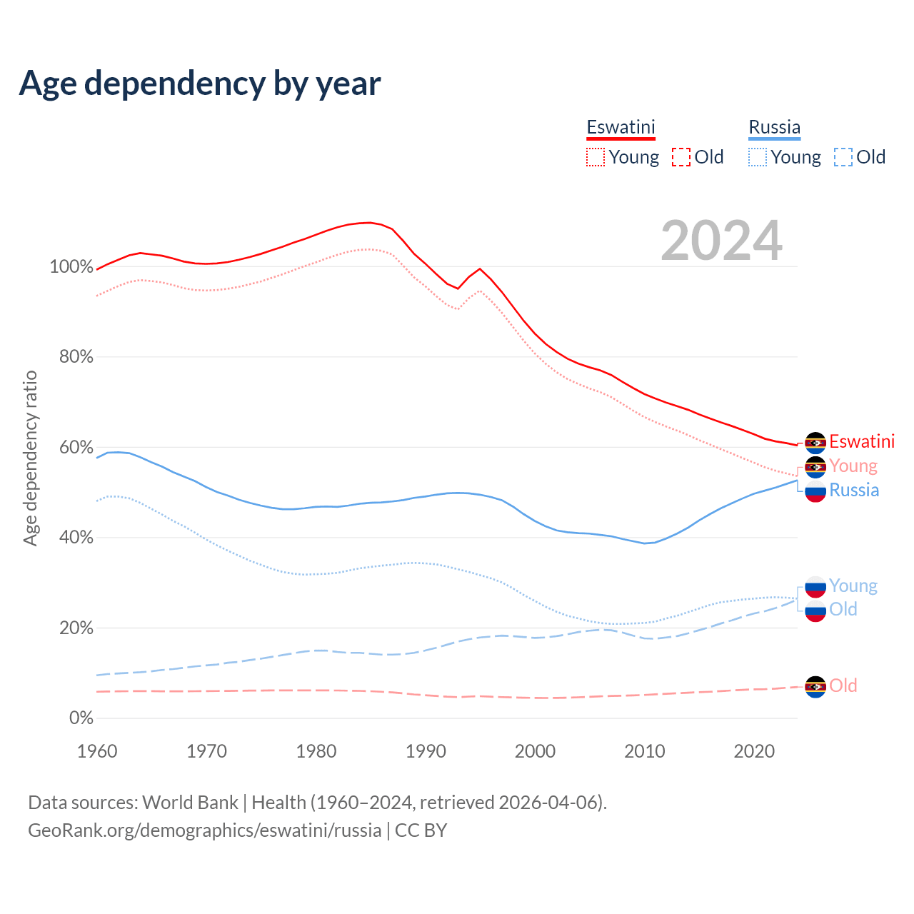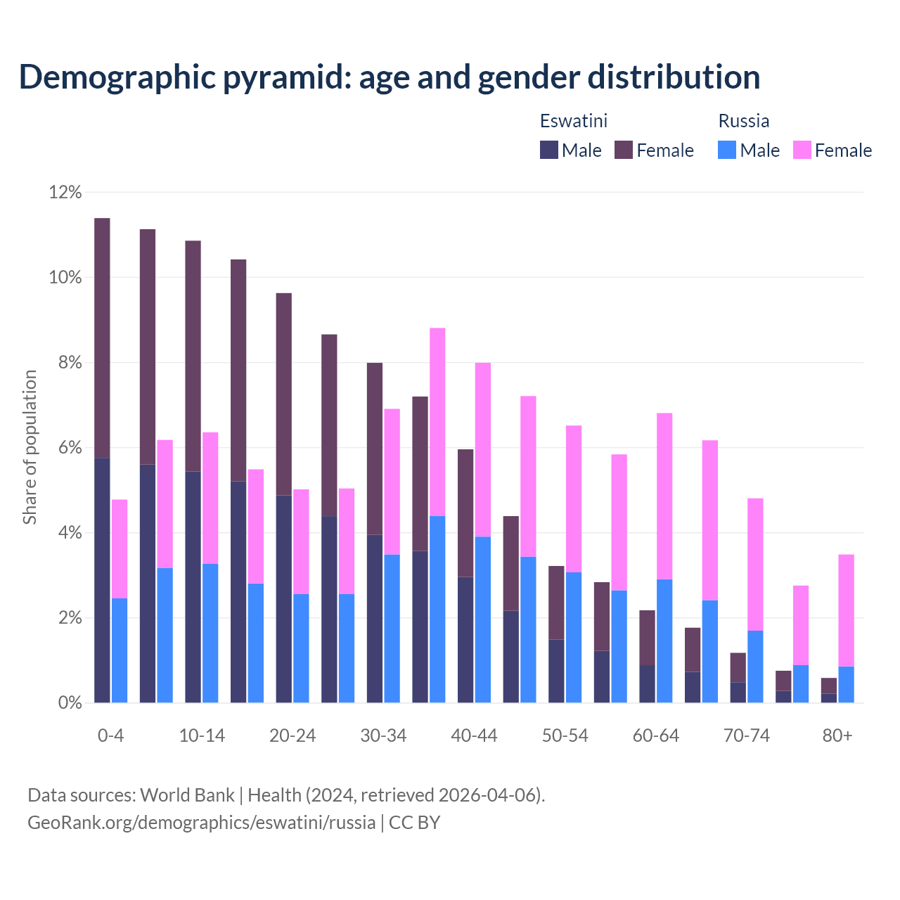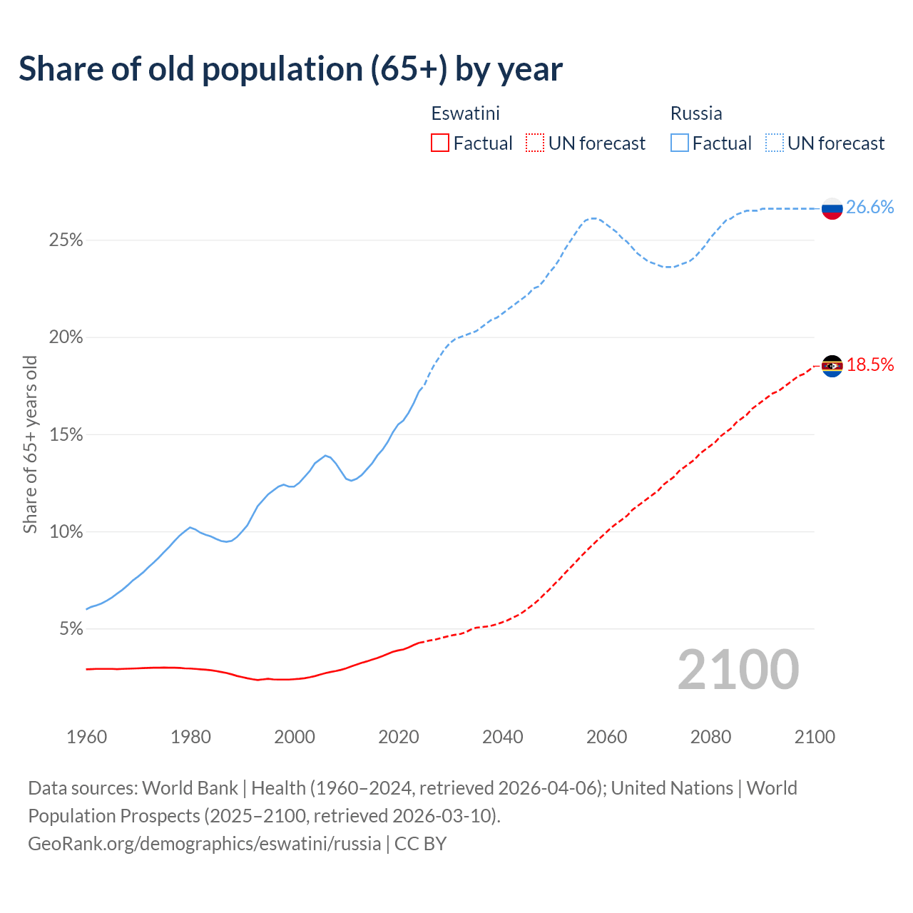 The share of older people aged 65 and over is 4.26% in Eswatini and 17.2% in Russia. Life expectancy in Eswatini compared to Russia .