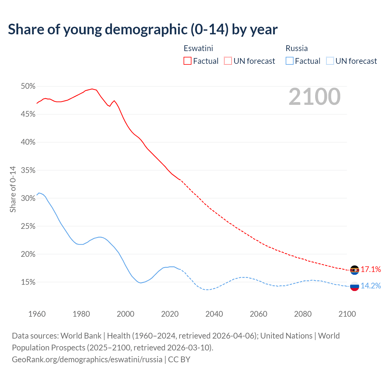 - The share of young demographic (0-15 years old) in Eswatini is 33.4% vs 17.3% in Russia.