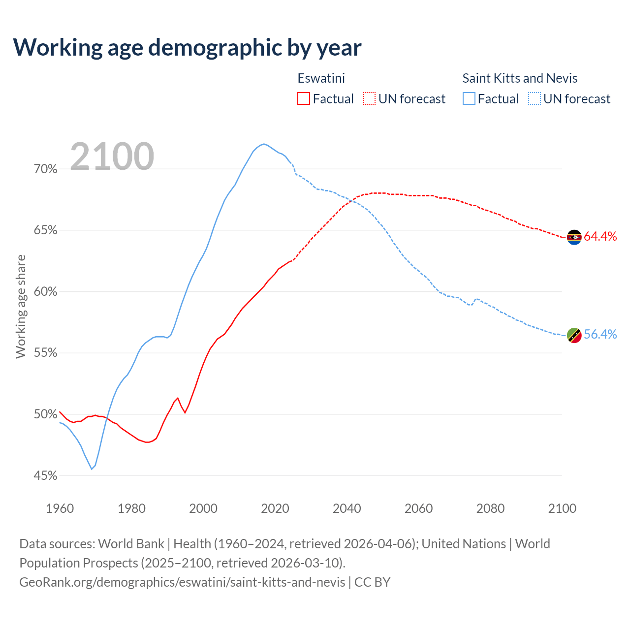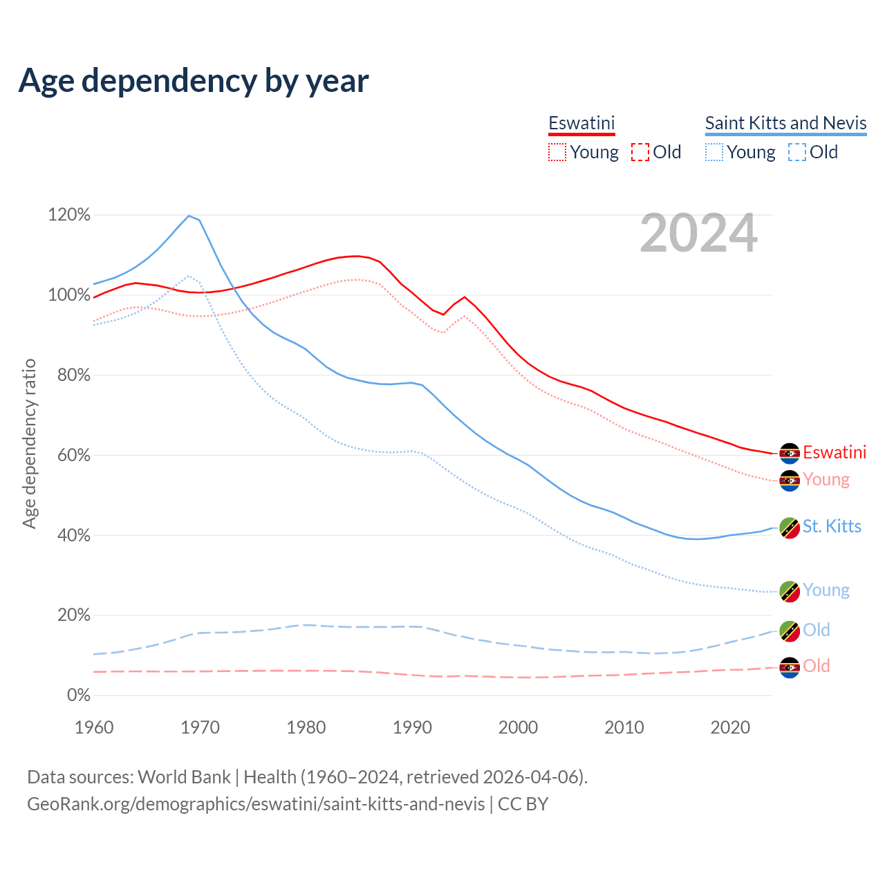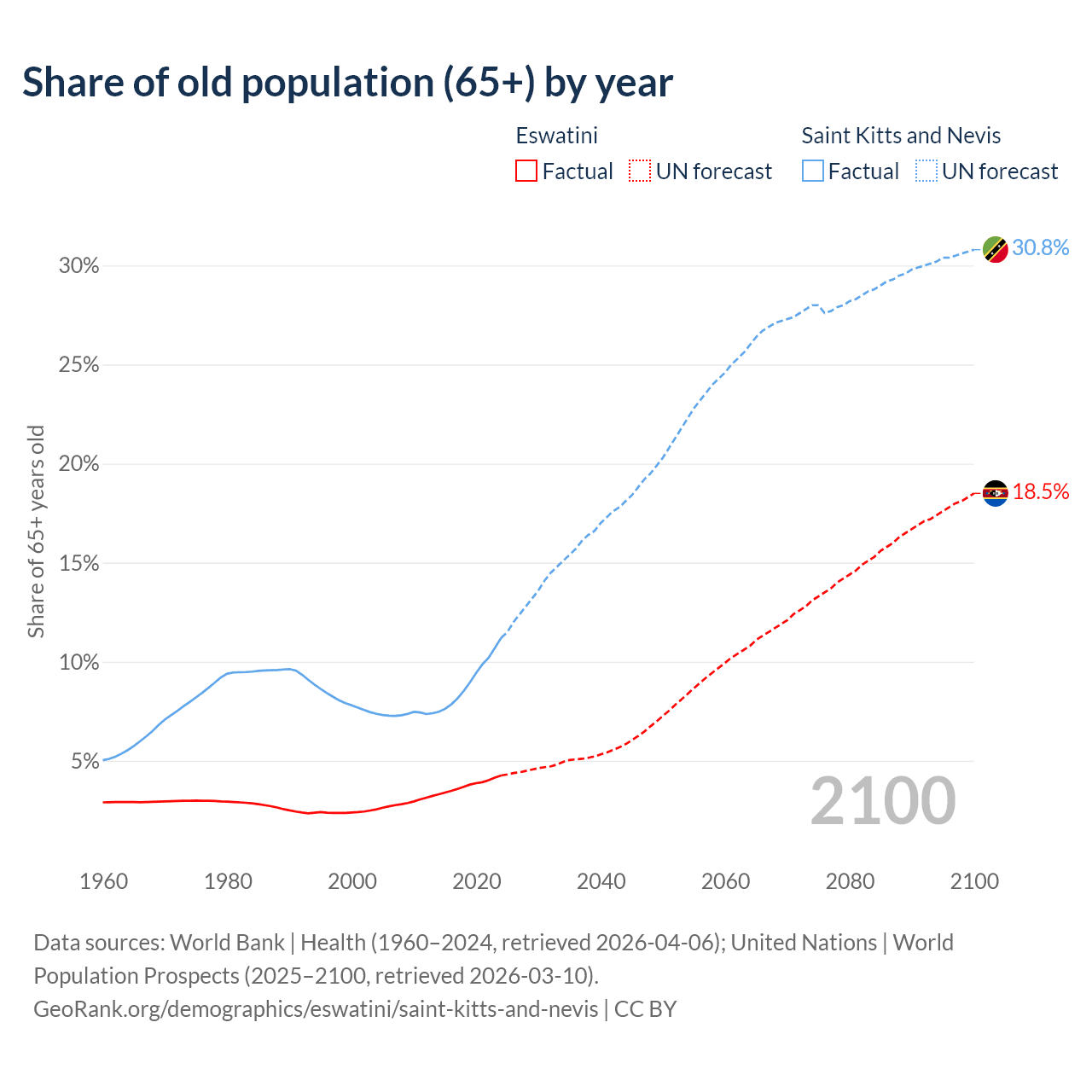 The share of older people aged 65 and over is 4.26% in Eswatini and 11.2% in Saint Kitts and Nevis. Life expectancy in Eswatini compared to Saint Kitts and Nevis .