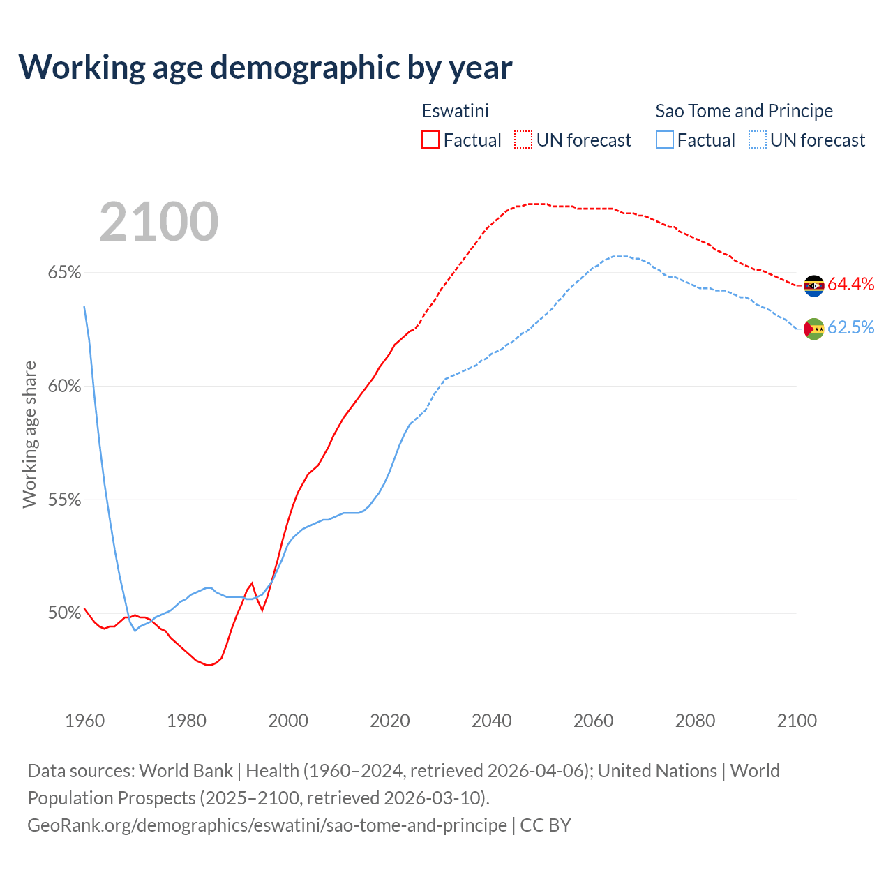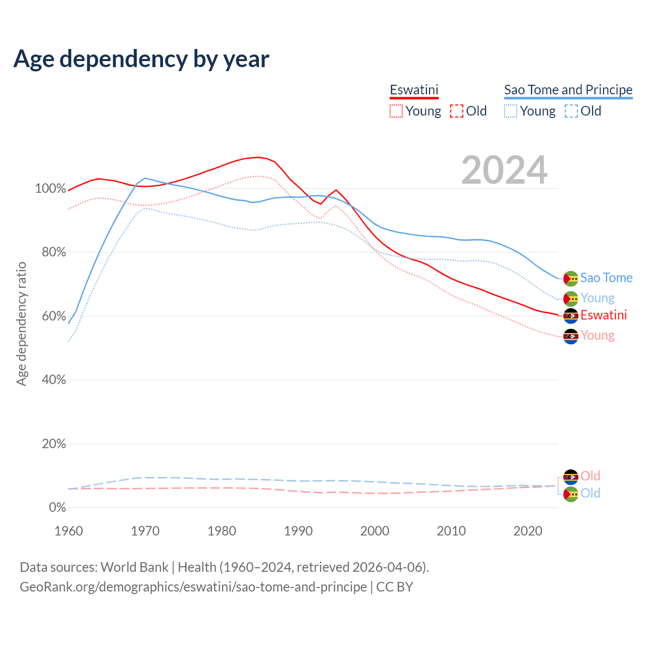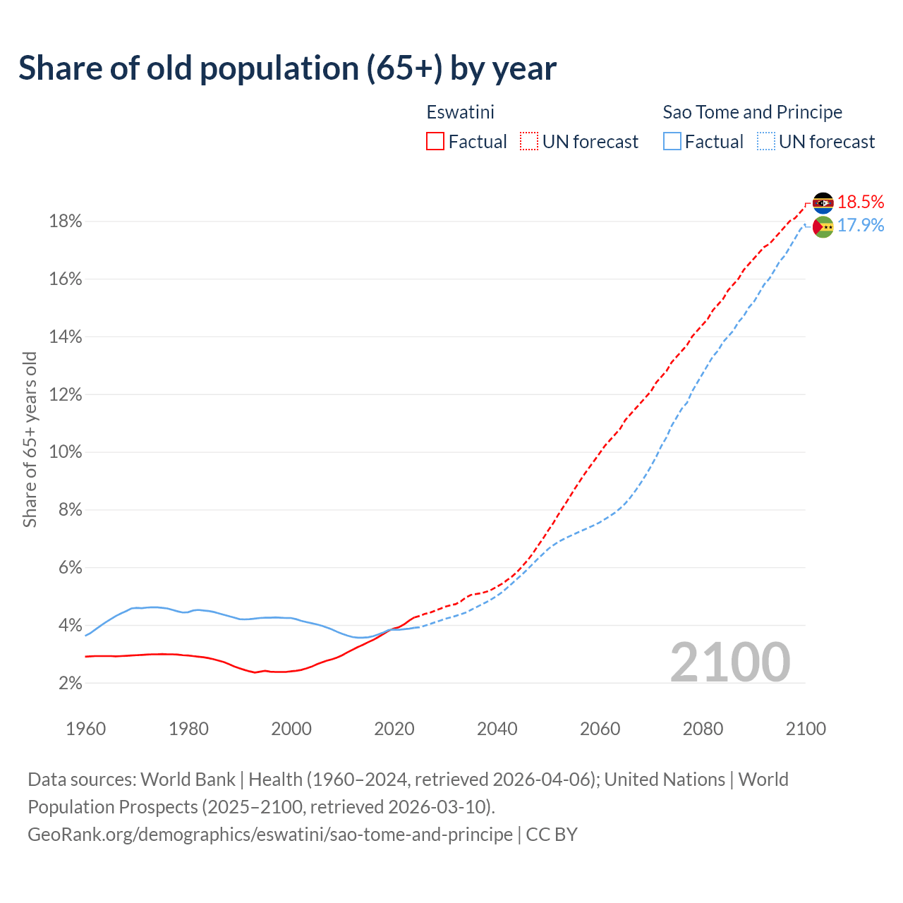 The share of older people aged 65 and over is 4.26% in Eswatini and 3.9% in Sao Tome and Principe. Life expectancy in Eswatini compared to Sao Tome and Principe .