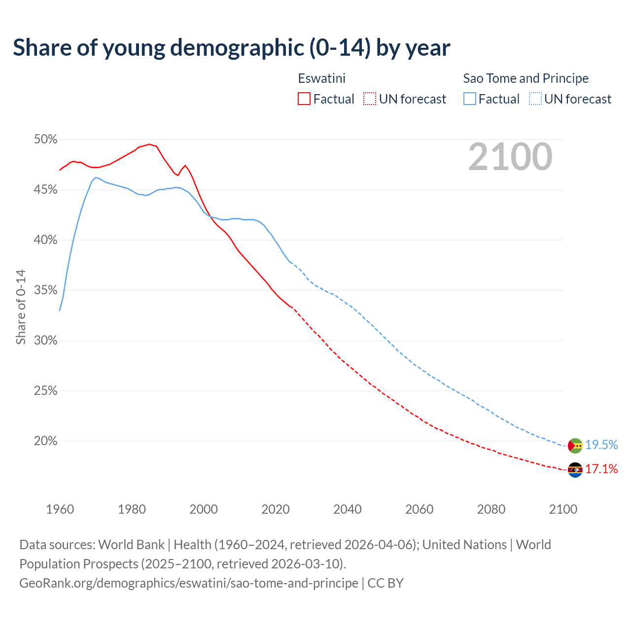 - The share of young demographic (0-15 years old) in Eswatini is 33.4% vs 37.8% in Sao Tome and Principe.
