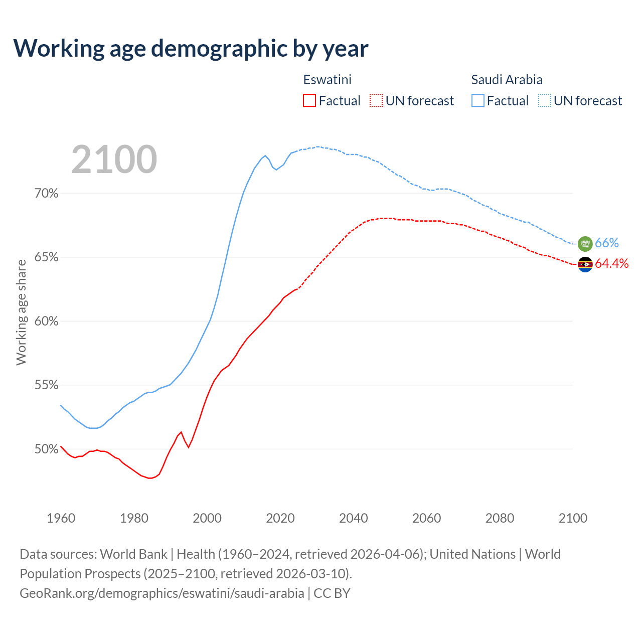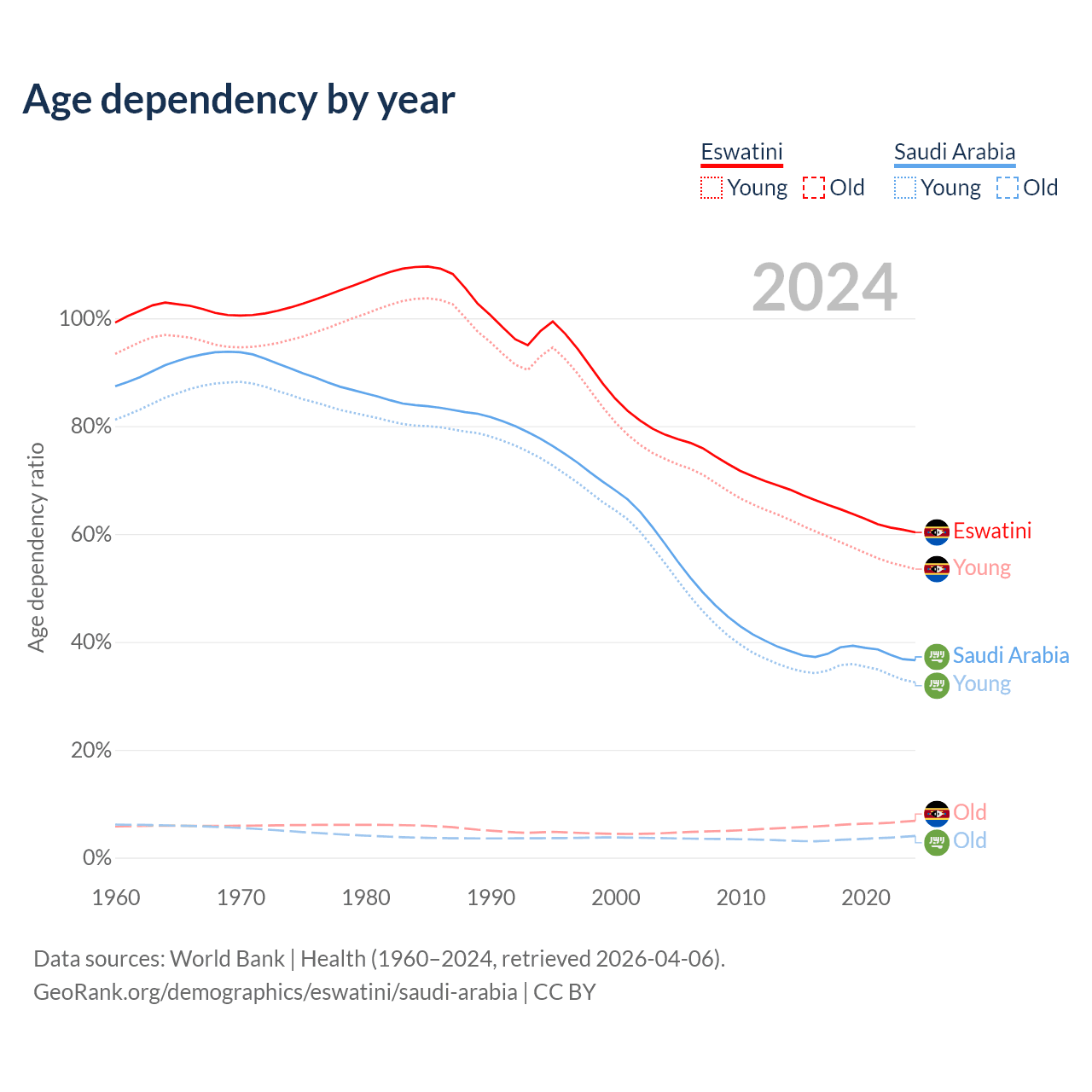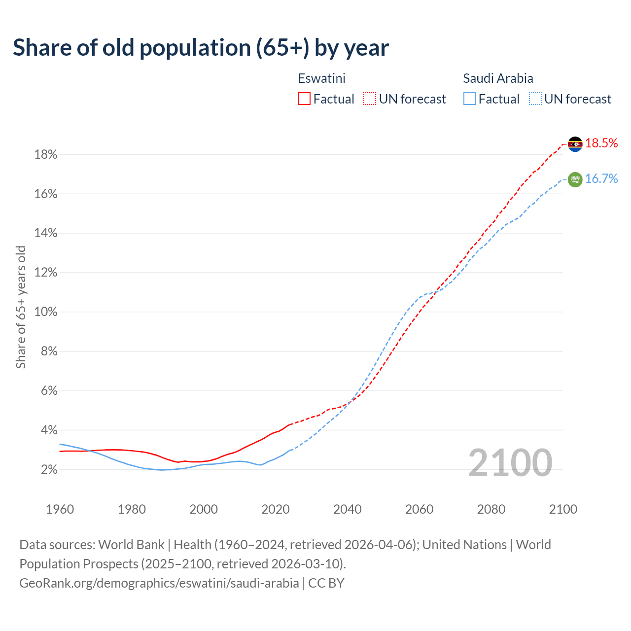 The share of older people aged 65 and over is 4.26% in Eswatini and 2.95% in Saudi Arabia. Life expectancy in Eswatini compared to Saudi Arabia .