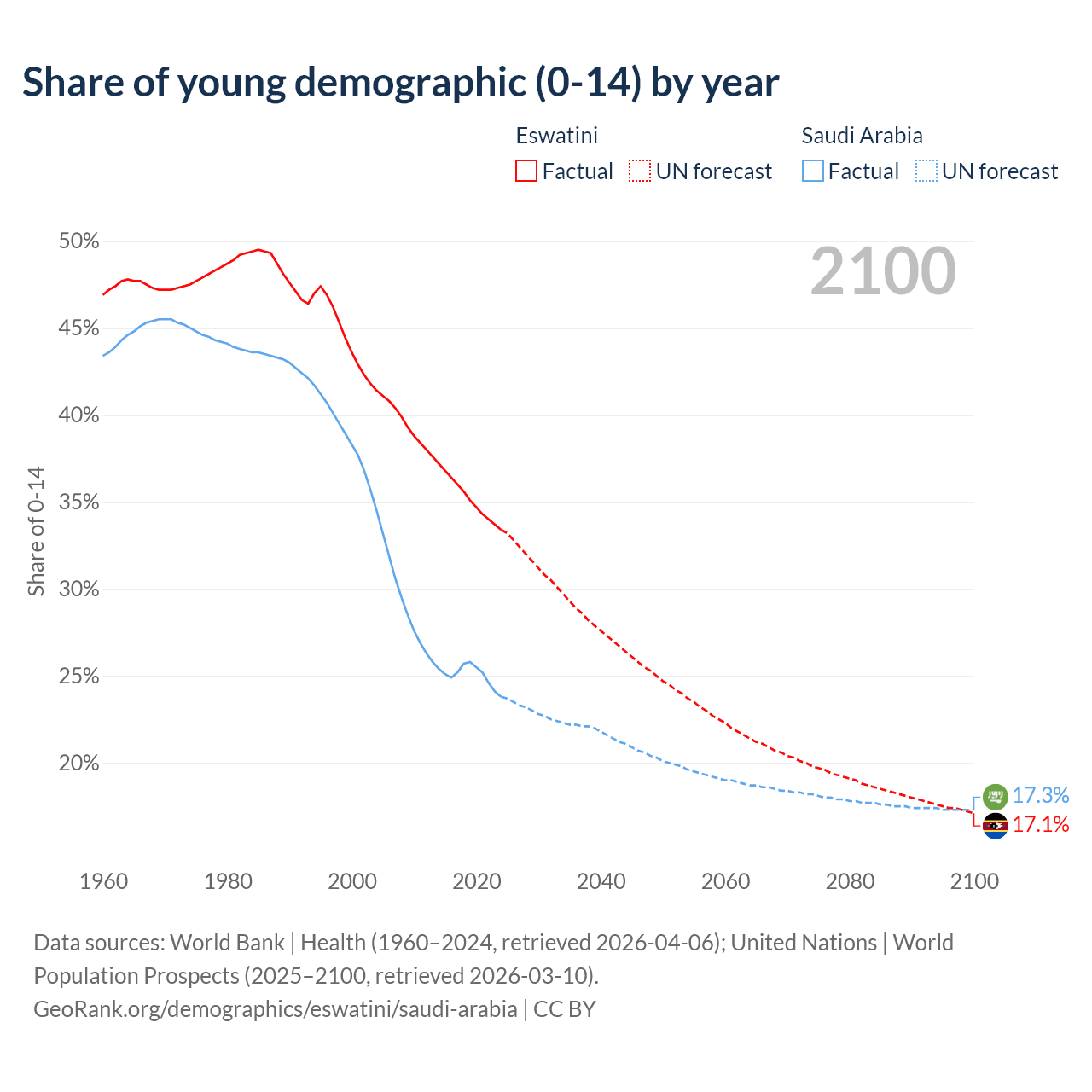 Median age Eswatini vs Saudi Arabia, 1960-2100
