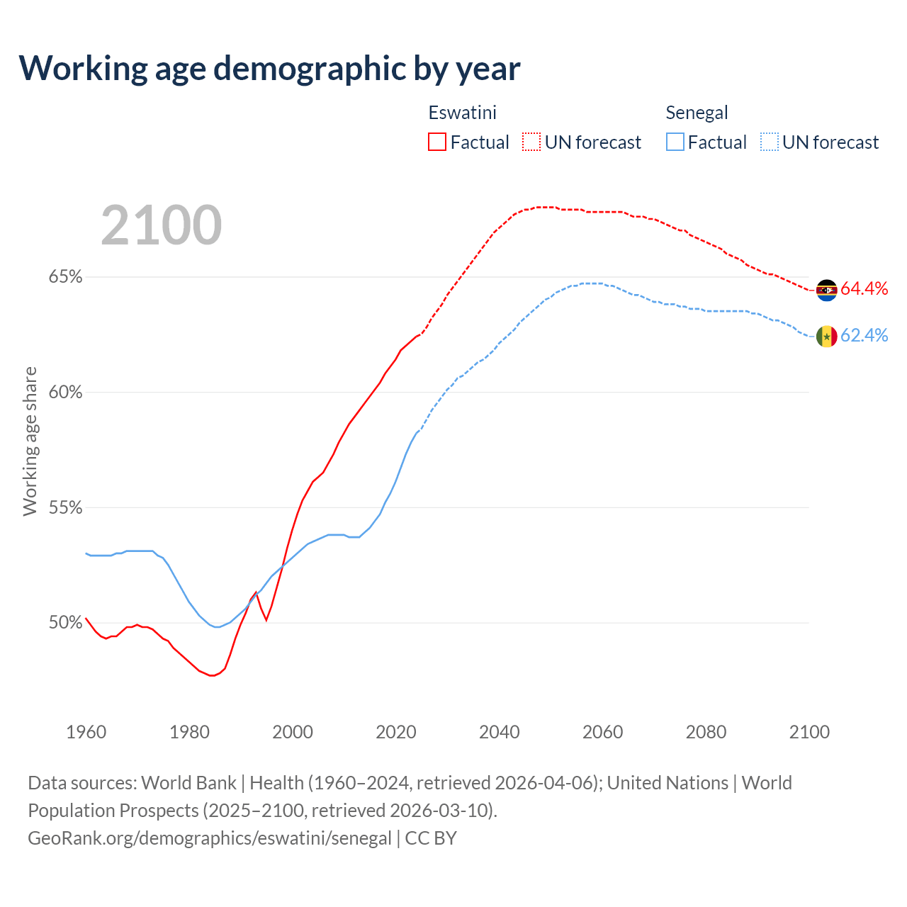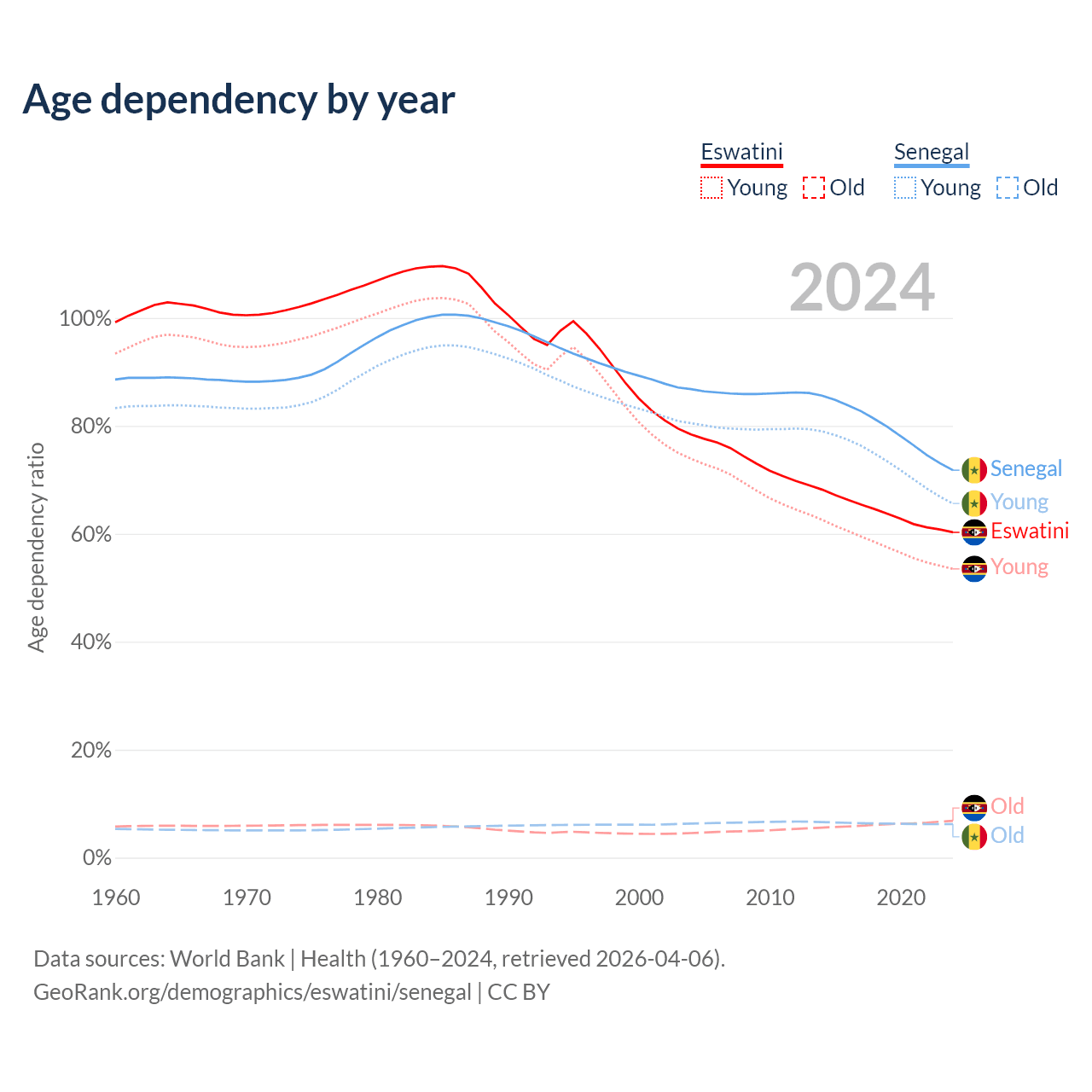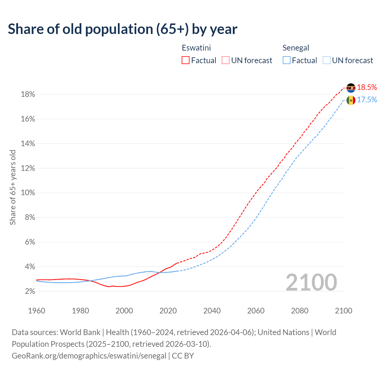 - The share of old-age demographic (65+) in Eswatini is 4.26% vs 3.62% in Senegal.
