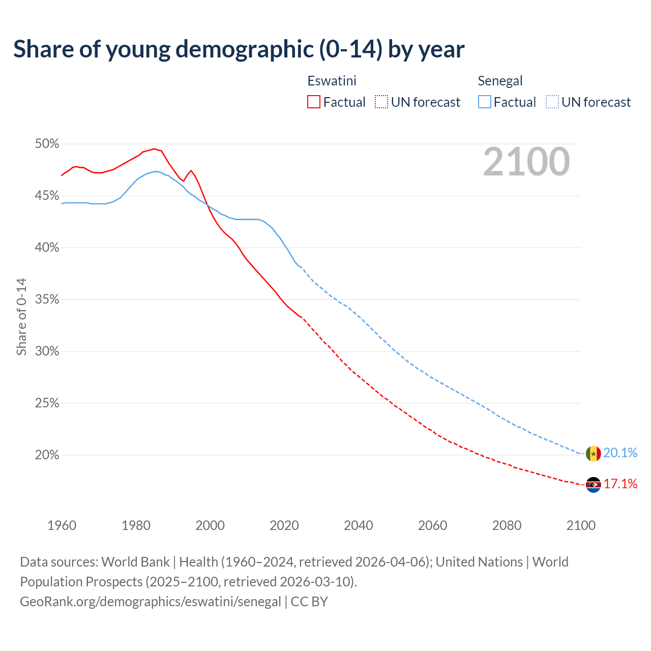 - The share of young demographic (0-15 years old) in Eswatini is 33.4% vs 38.2% in Senegal.