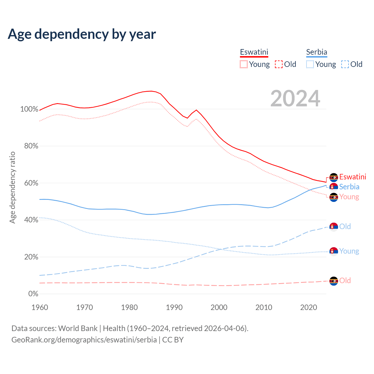 - The share of old-age demographic (65+) in Eswatini is 4.26% vs 22.7% in Serbia.