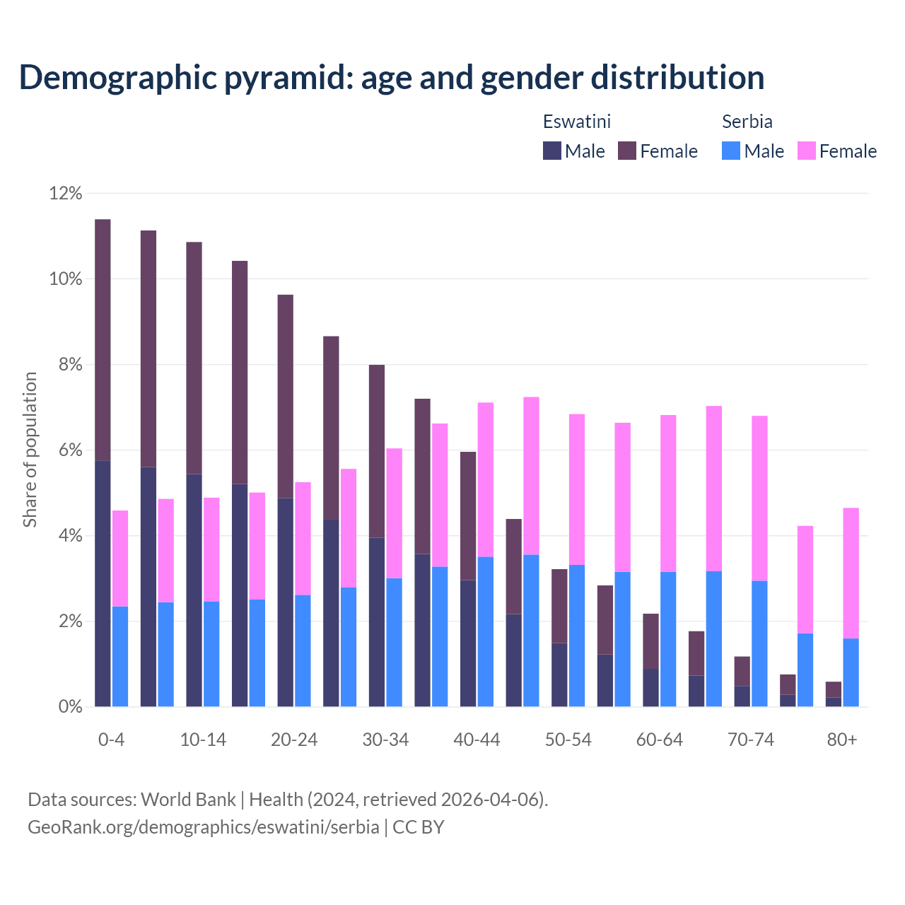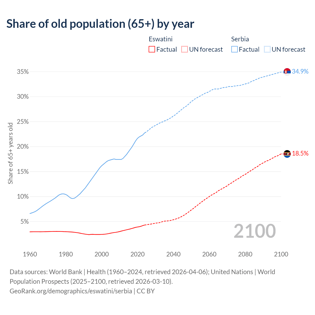The share of older people aged 65 and over is 4.26% in Eswatini and 22.7% in Serbia. Life expectancy in Eswatini compared to Serbia .